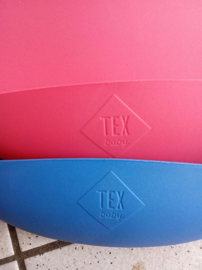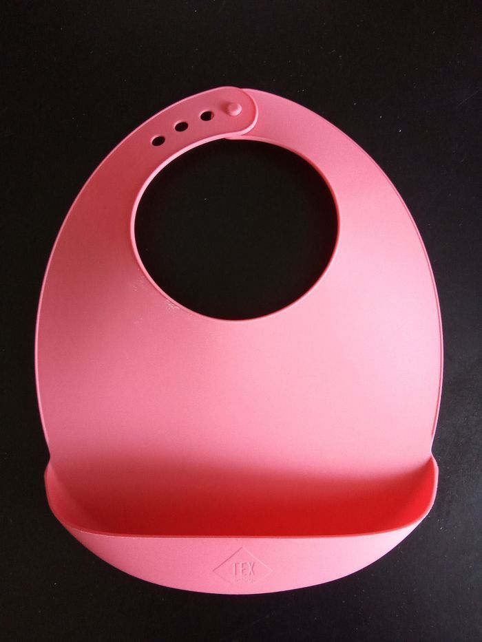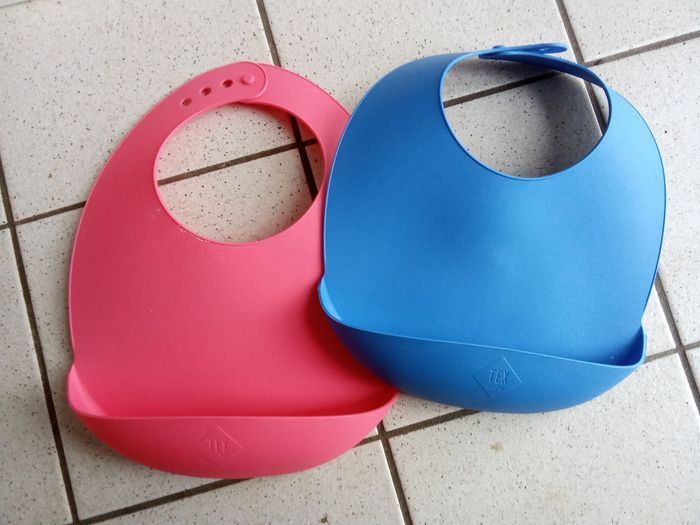 bavoirs récupérateur en silicone marque tex, fermeture par pressions à l'arrière pour adapter àu tour de cou de l'enfant. Utilable de 6 à 24 mois environ. bon état. La véritable couleur est sur les 2 dernières photos 1 autre bleu mm marque également à vendre ds mon dressing et réduction activée