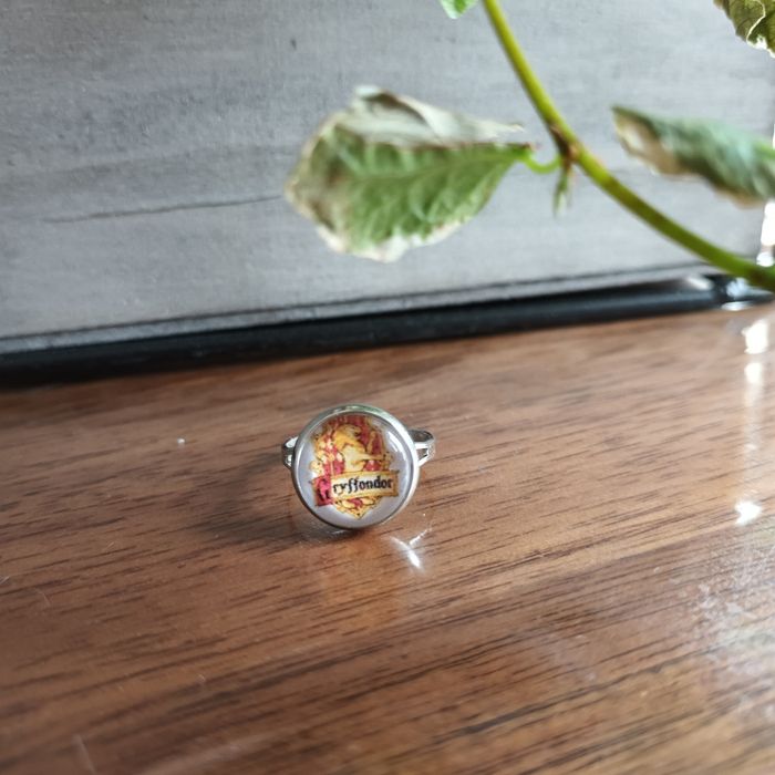 Bague réglable fantaisie argentée représentant la maison Griffondor à Pourdlard (saga Harry Potter) neuve. Le motif fait 12mm de diamètre