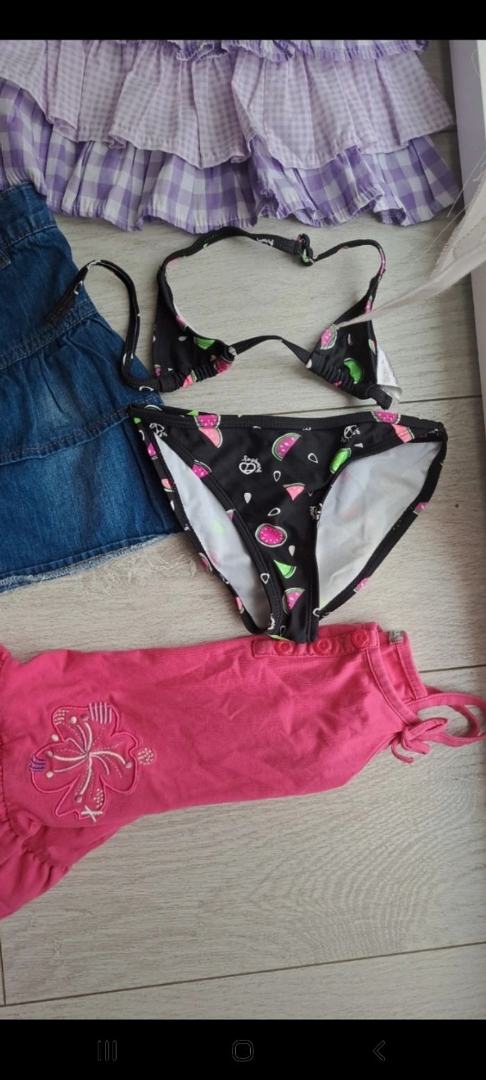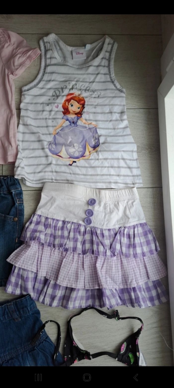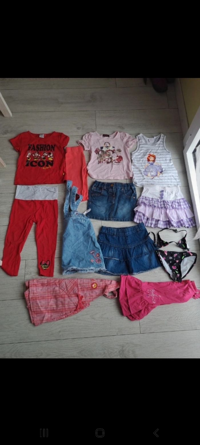 Lot de 12 vêtements 3 ans fille printemps été. Lot en très bon état. Certains vêtements neufs. Composé 2 robes, 1 robe combishort, 2 tee-shirts, 1 legging, 3 jupes et 1 maillot de bain 2 pièces 1 ensemble legging tee-shirt Marques Orchestra kiabi Longboard Disney...
