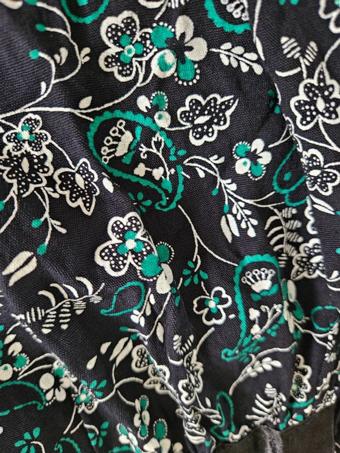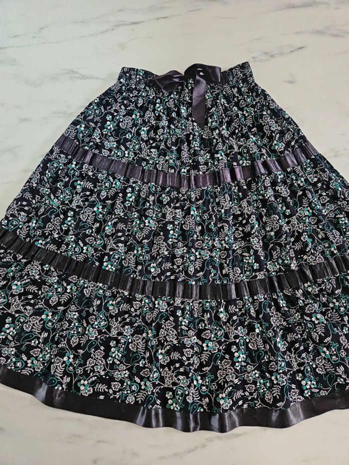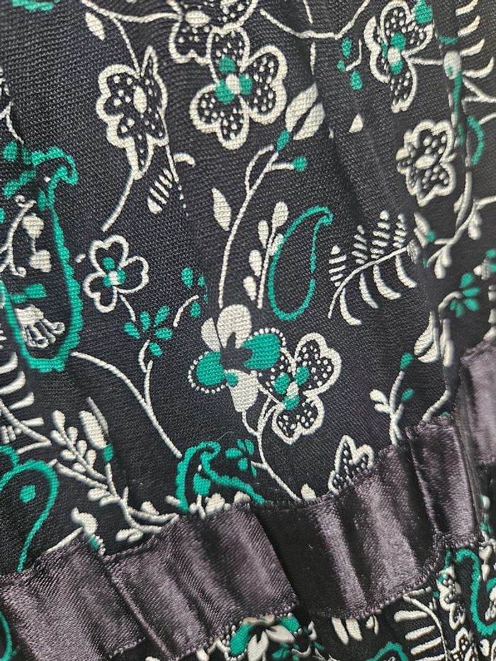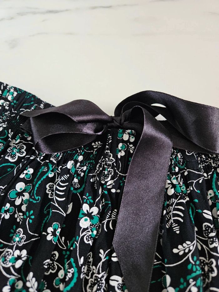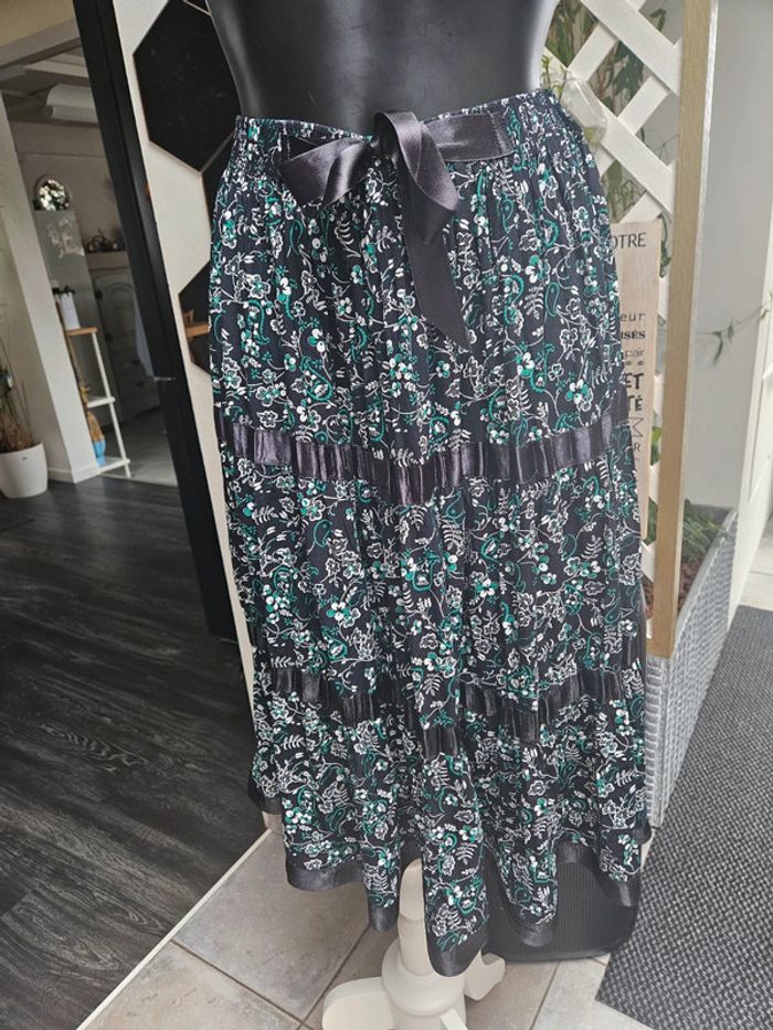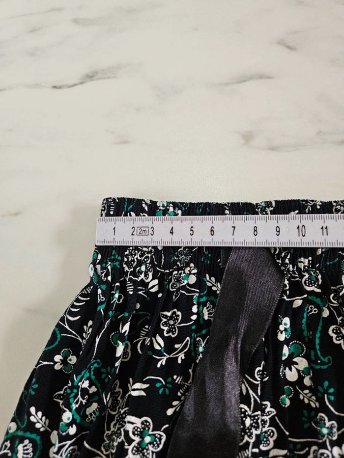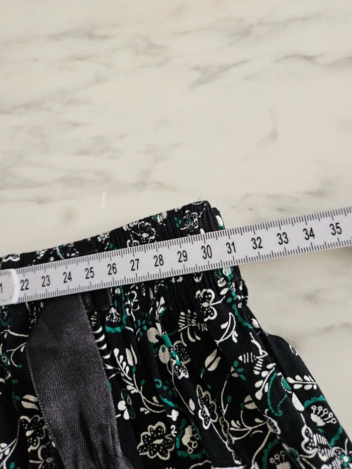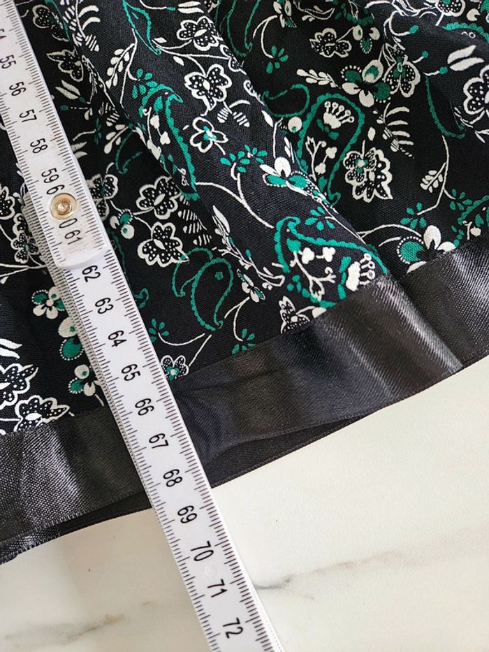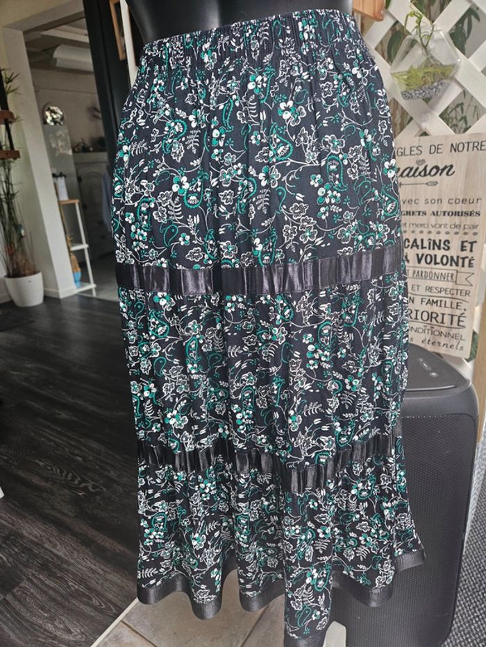 Superbe jupe évasée noir à fleurs vertes et blanches. Elle est en parfait état. Taille élastique et les dimensions se trouvent sur les photos. Aucune étiquette