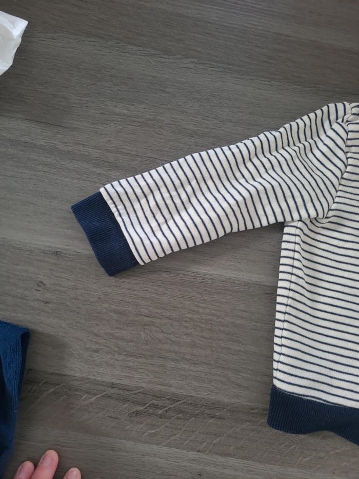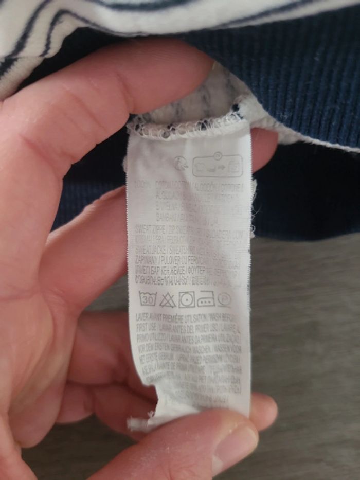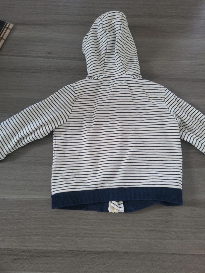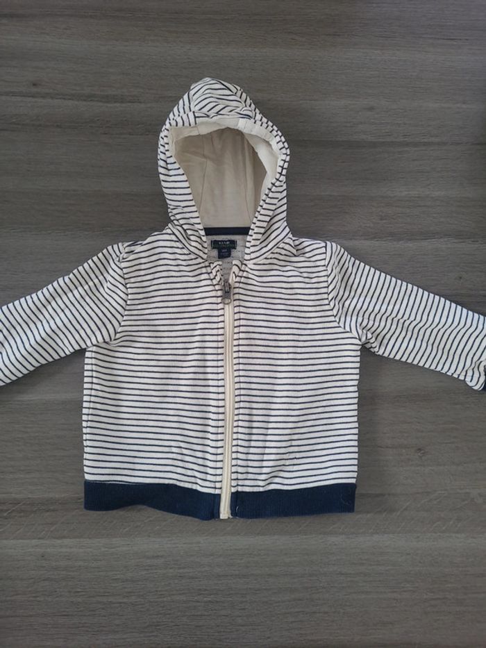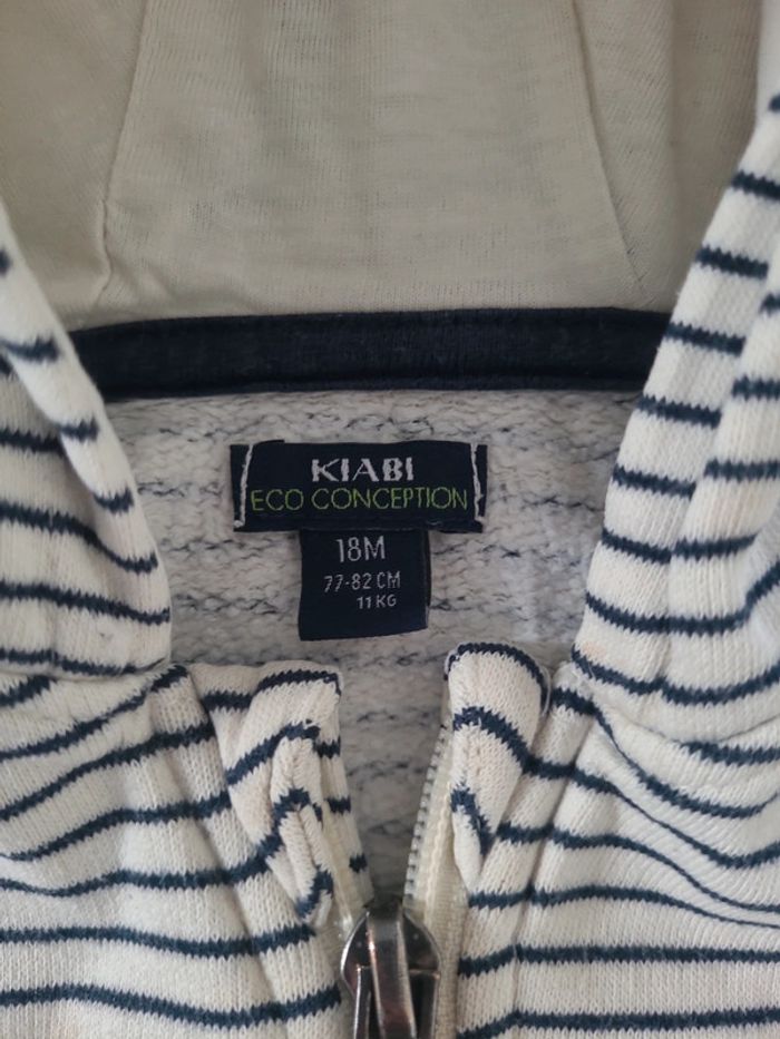 Joli gilet de la marque kiabi. De couleur blanc et bleu marine. A capuche et se ferme avec la fermeture éclair. 🎀 18 mois 🎀 77-82 cm 🎀 100% coton 🎀 kiabi 🎀 très bon état #elodiectr44giletbebe18mois