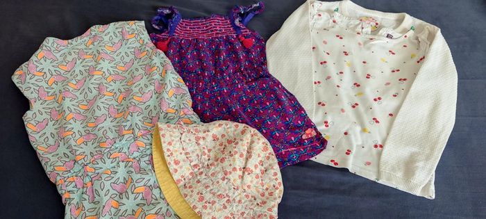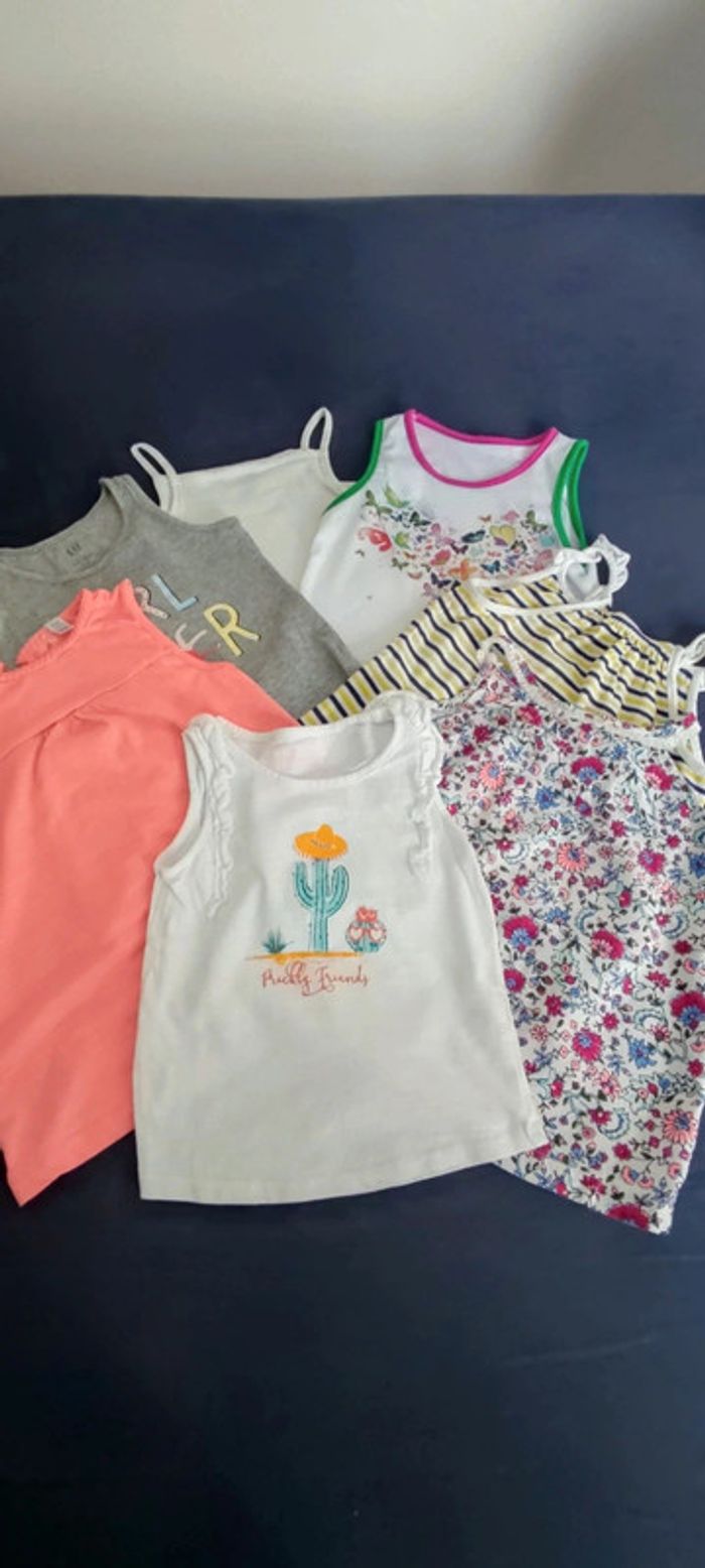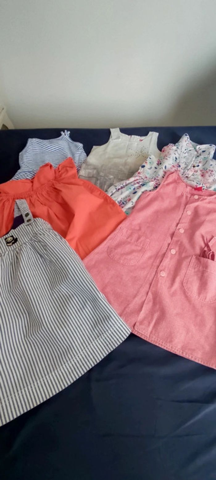 30 pièces : 1 chapeau réversible 7 débardeurs 8 t-shirts 1 ensemble T-shirt+gilet 4 shorts 2 combi-shorts 1 jupe 6 robes GAP OKAÏDI SERGENT MAJOR ZARA IKKS CATIMINI KIABI ORCHESTRA TEX CARTER'S LILY MARELLE