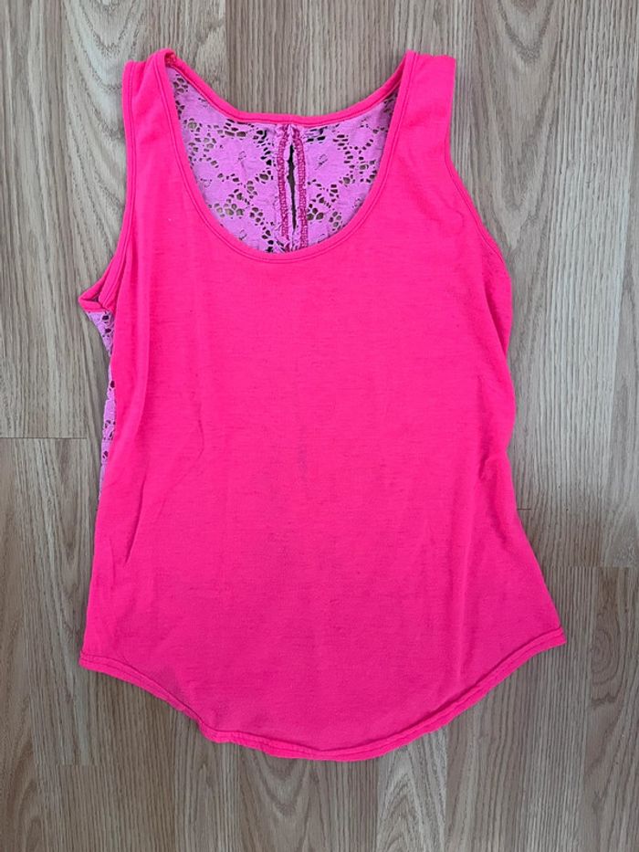 Vends débardeur rose flash Dos en dentelle avec noeud noir Très bon état Taille S ou petit M Sans marque Possibilité de lot. Autres débardeurs dans mon dressing
