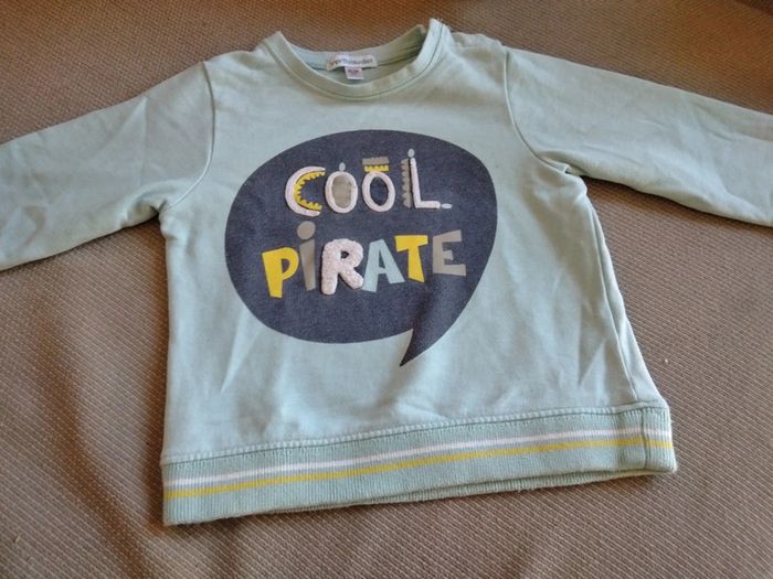 Pull de la marque Vertbaudet taille 2 ans. Cool pirate. Tâche cf photo 3. Pressions épaule.