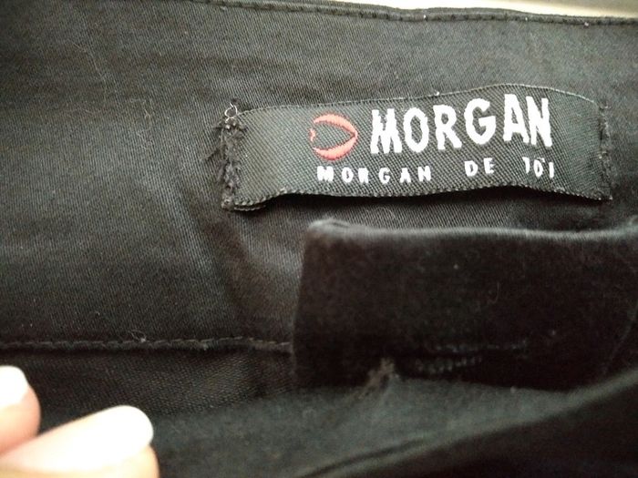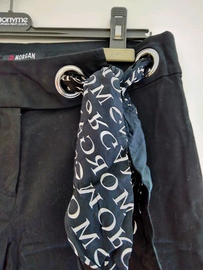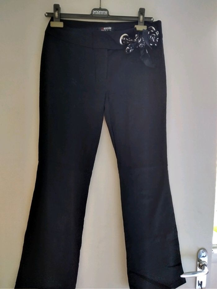 Pantalon noir de la marque MORGAN taille 38. Pantalon habillé. Ceinture avec bouton, fermeture éclair, deux aggraphes et foulards Morgan (cf photo).