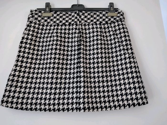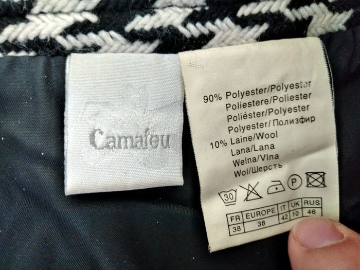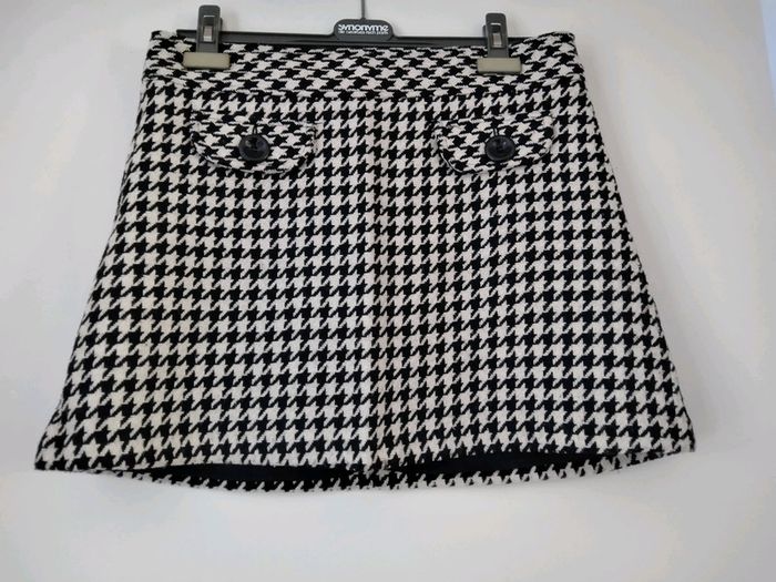 Jupe courte de la marque Camaïeu en taille 38. Doublée. Laine et Doublure polyester. Fermeture éclair dos. Noire et blanche. Très bon état.