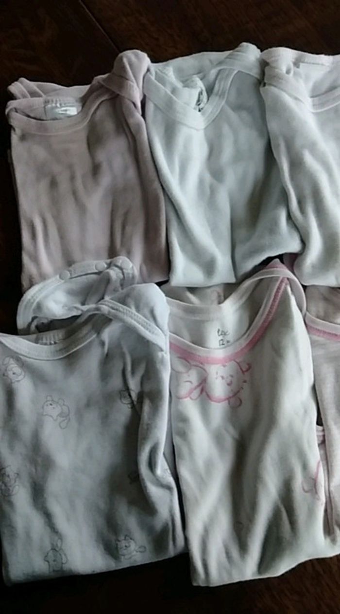 Lot de 9 bodys 12 mois. Manches courtes. Deux sont un peu tachés.