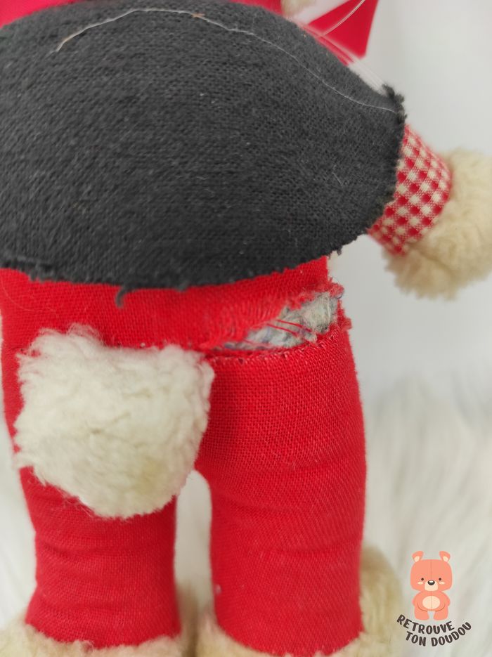 🐇 Peluche Lapin Beige langue rouge, tissu vichy rouge, cape noire, ruban rouge, marque Windel, Vintage années 90'. 📏 Dimension : 23 cm environ (sans oreilles) ✨ Occasion, correct, troué 🧼 Passage vapeur 👀 Vous achetez le doudou que vous voyez sur les photos