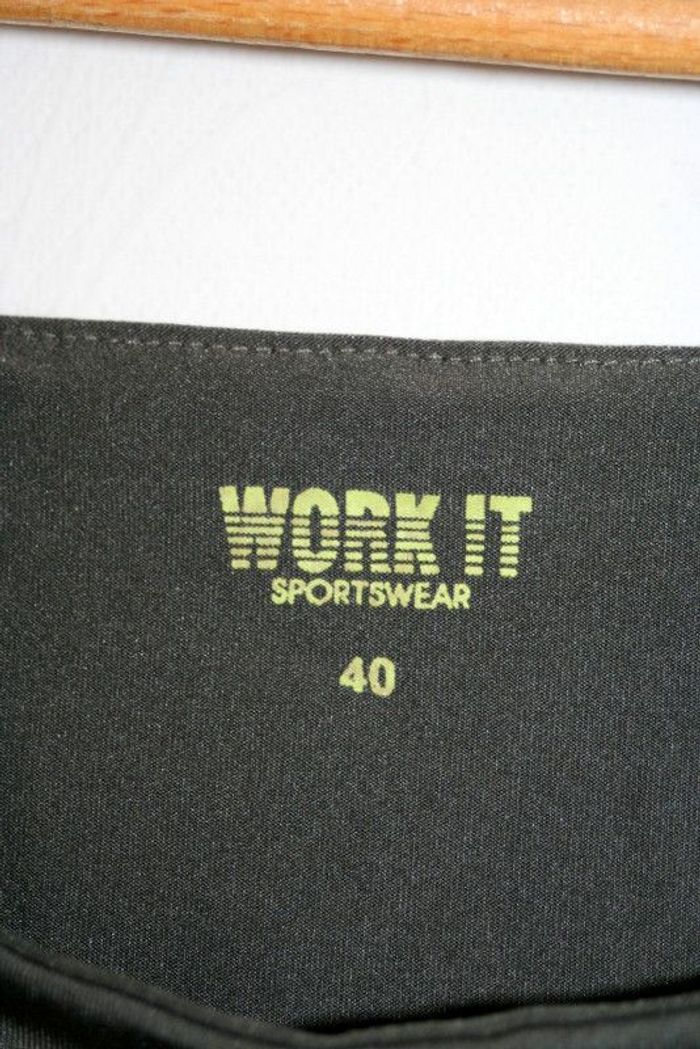 Haut de sport kaki marque Work it, taille 40, doublure élastique pour maintien de la poitrine cf photo, 87% polyester + 13% élasthanne, 170g