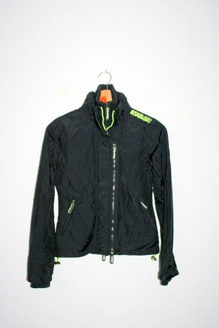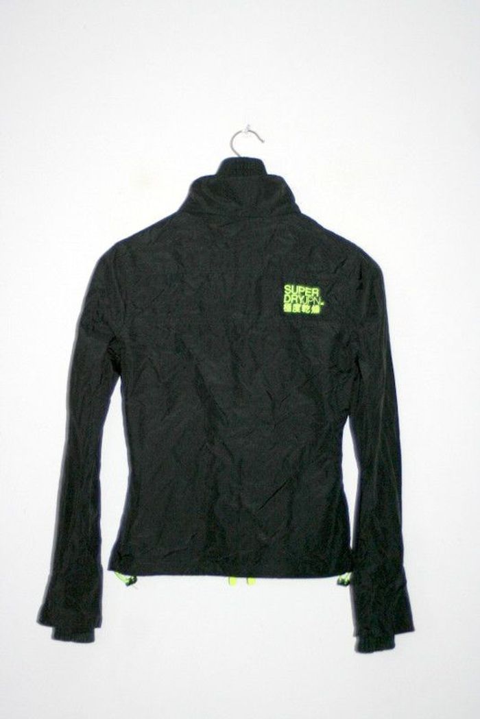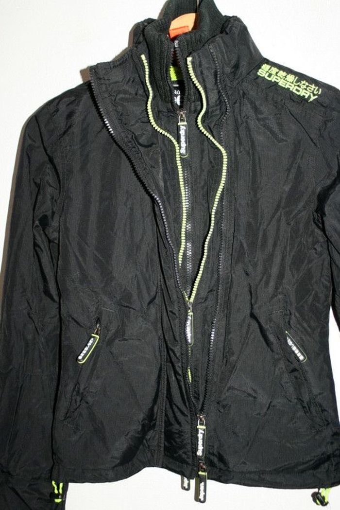 Coupe-vent noir Superdry, taille XS, triple fermeture éclair, passage pour les pouces au bout des manches cf photos, 100% nylon, doublure 100% polyester, élastique en bas du coupe-vent pour resserrer à remplacer, 600g