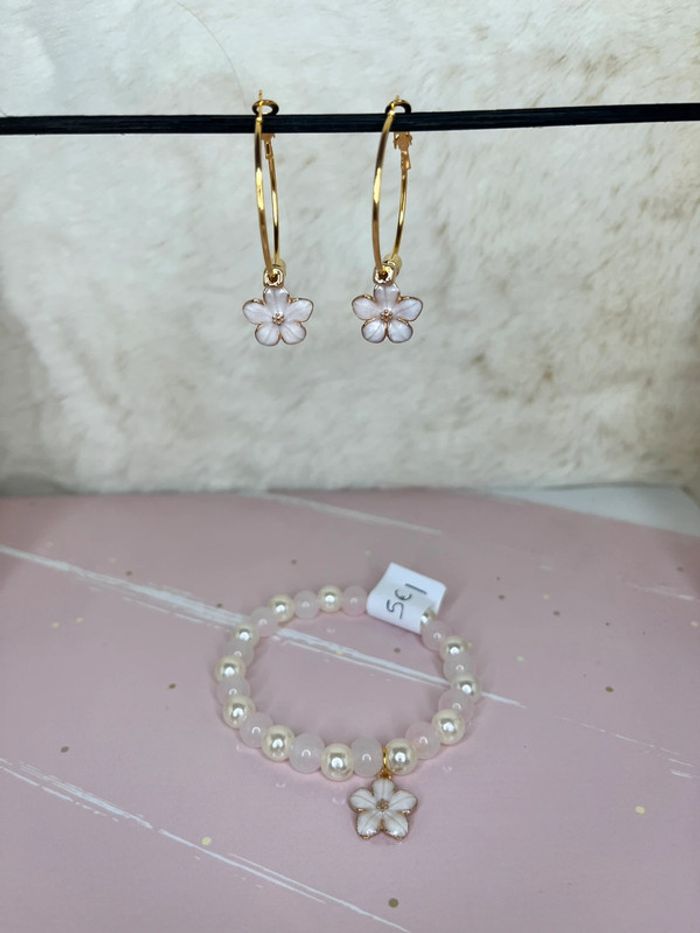 Vends parure boucles d’oreilles et bracelet avec fleurs. Boucles en acier inoxydable Perles rosé Fait main