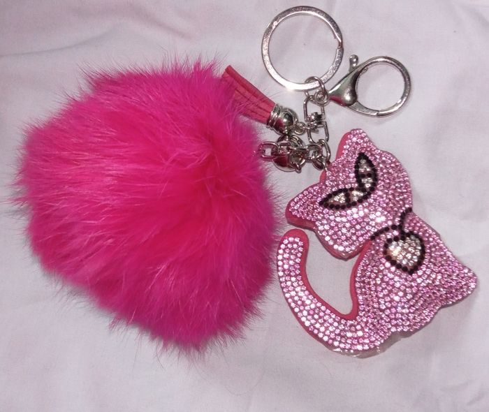 Porte-clé accroché sur des clés une trousse ou un sac. il est argenté avec un gros pompon rose fushia et un chat recouvert de strass. NEUF