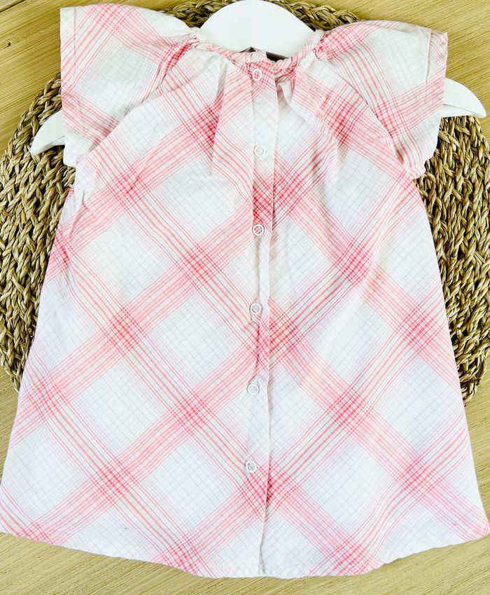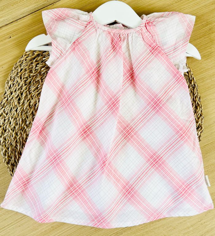 Robe à carreaux de la marque P’tit bisou en très bon état. Entièrement doublée, très légère, boutonnée dans le dos pour faciliter l’habillage, manches forme papillon. Taille : 6 mois (67cm)