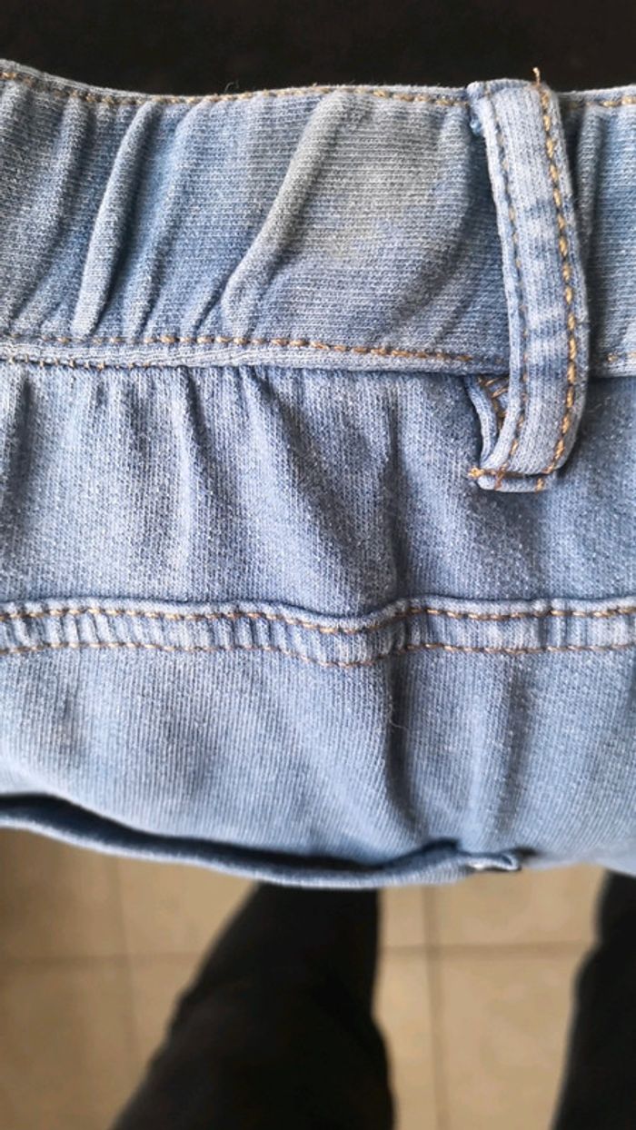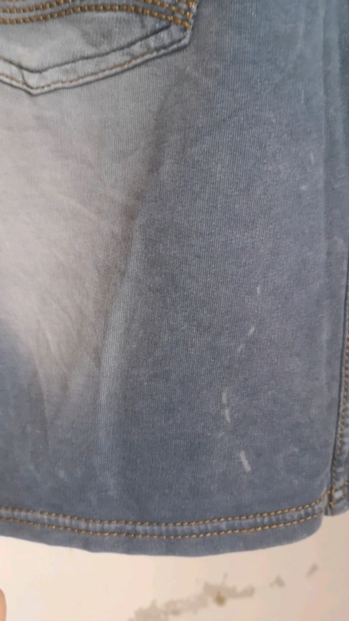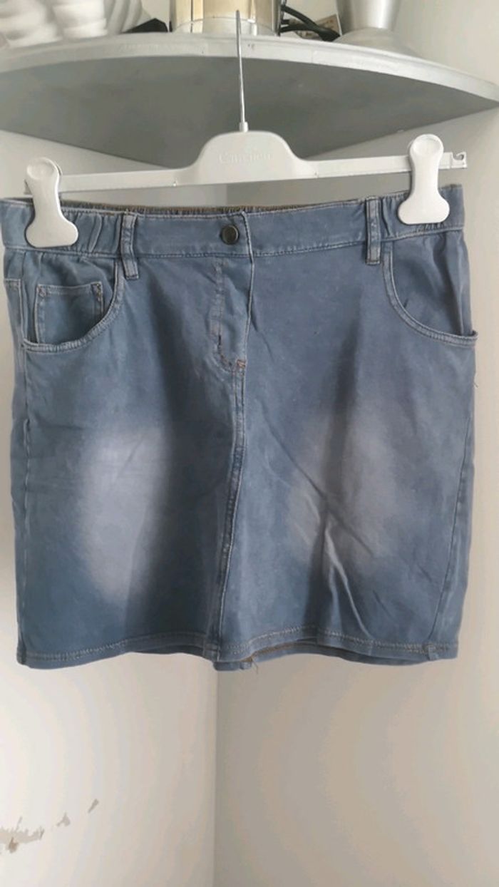 Jupe effet jean mais matière légère et agréable 2 poches arrières Taille élastique bouton décoratif 38/40 Largeur a plat environ 38cm Longueur environ 42cm Petites taches blanches et une à la taille voir photo