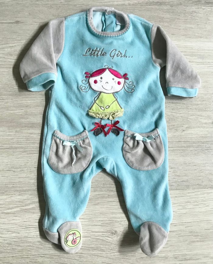 Grenouillère en velours bleu turquoise Motif fillette et texte Poches Ouverture par pressions à l’arrière Taille grand donc 0-1mois