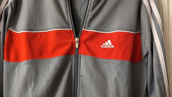 Veste de jogging Adidas garçon taille 12 ans coloris gris et rouge et les bandes blanches de la marque. Logo de la marque au cœur et dans le dos. Je marque uniquement bon état même si certaines personnes qualifieraient sûrement la veste de très bon état car je suis très regardante. Mes autres annonces du même âge #joeypotter91_garçondouzeans [Caisse lézard]