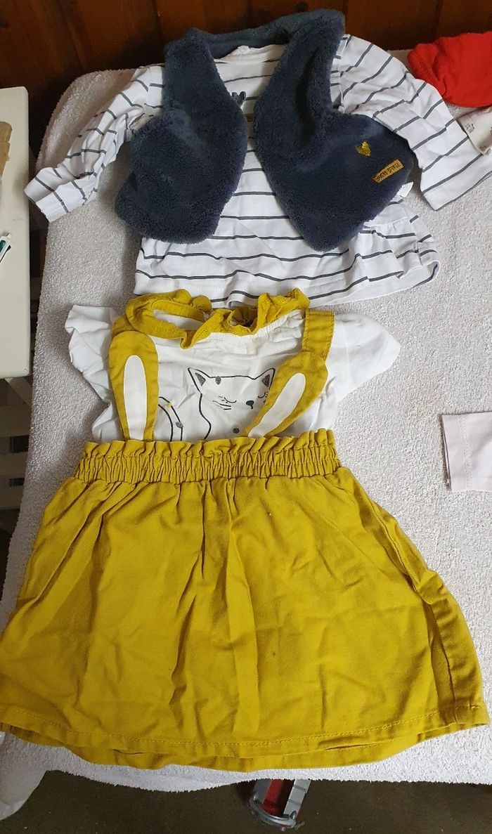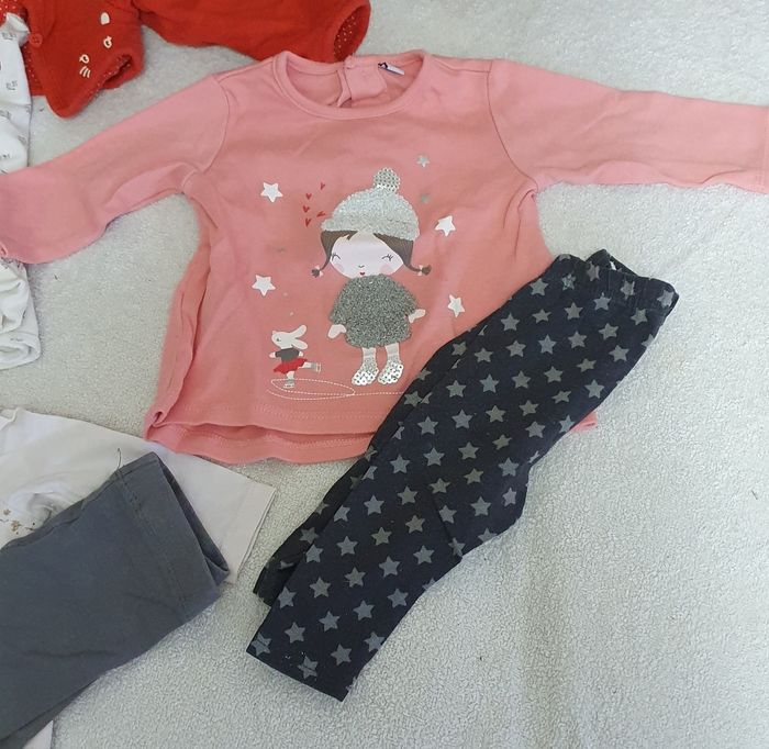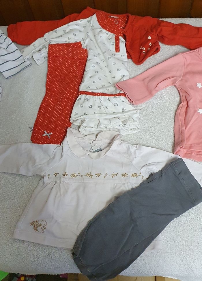 Contient 5 ensemble pour toutes saisons, dont l'ensemble robe est du été, en taille 3 mois en très bon état pas de tache ni de trou Il y à en marque : kiabi, orchestra mul