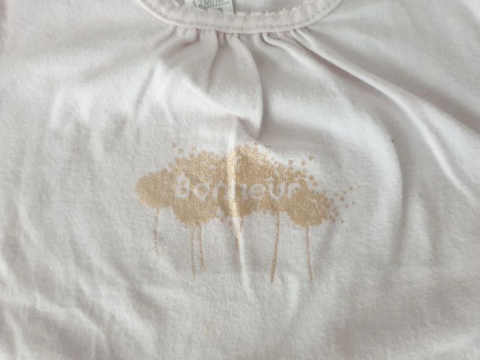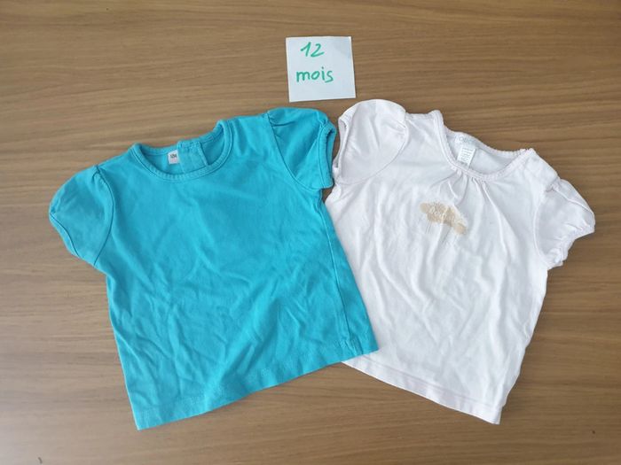 12 mois Peu portés 1 bleu turquoise sans marque 1 rose pâle Obaïbi avec dessin doré Réduction sur les lots #teeshirtmanchescourtes #manchescourtes