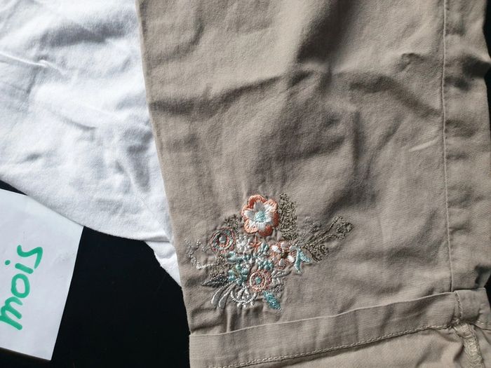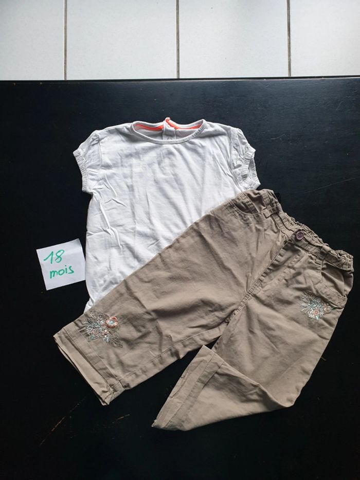 18 mois Beaucoup porté mais aucun défauts Tee-shirt manches courtes blanc Kiabi. 18 mois. L'étiquette a été enlevée Pantalon léger et large kaki avec des fleurs brodées. Tissaia Réduction sur les lots #co_fille_18mois