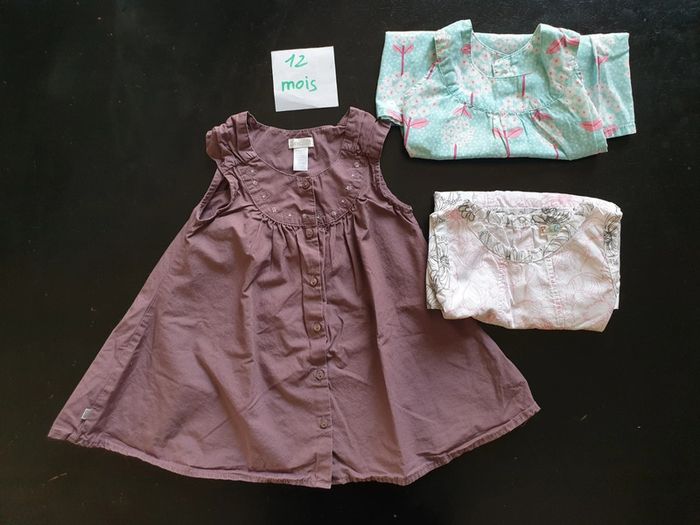 12 mois Portées quelques fois 1 aubergine, Obaïbi 1 bleu fleurie, H&M 1 blanche rose et marron, Pick Ouik