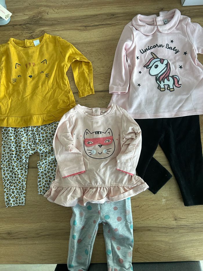 Lot de 3 ensembles pantalons 6 mois fille: - 1 ensemble carrefourkids léopard très léger - 1 ensemble districenter licorne pantalon imitation velour - 1 ensemble orchestra tête de chat masqué avec pantalon style jogging Tout est en très bon état