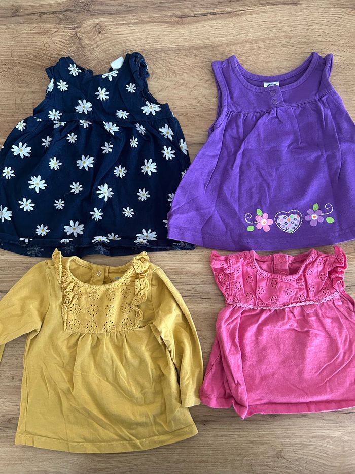 Lot avec 2 robes d’été et 2 tee shirt dont 1 manches longues Bon état