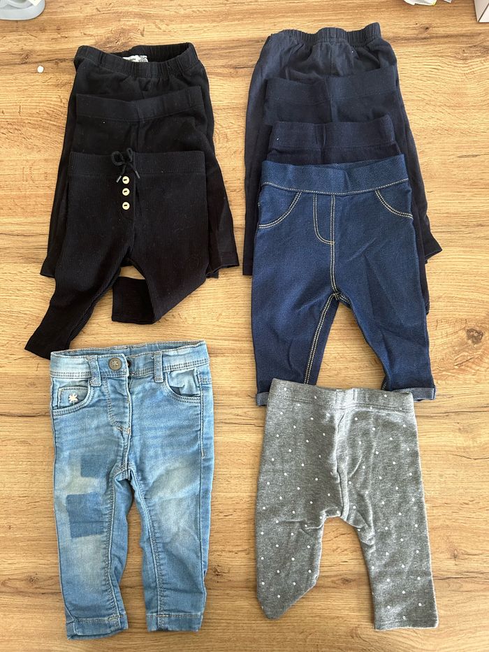 Lot de 8 pantalons dont 3 leggings noir, 3 leggings bleu, 1 jeans et 1 legging gris