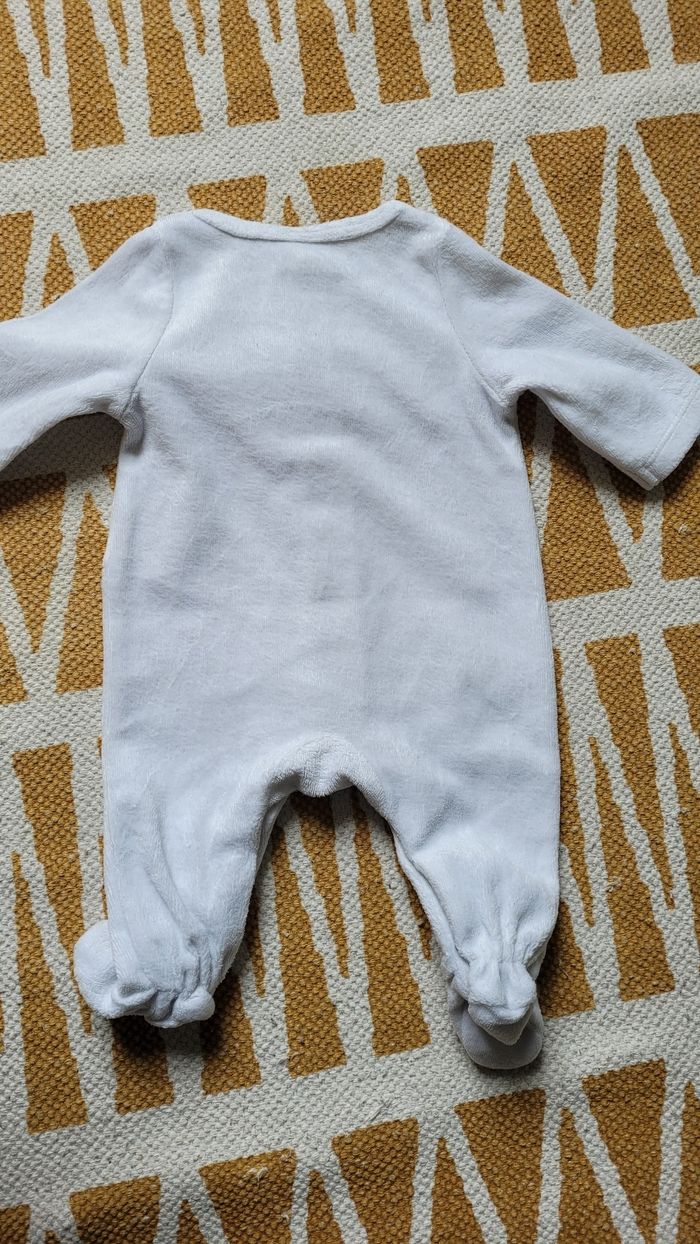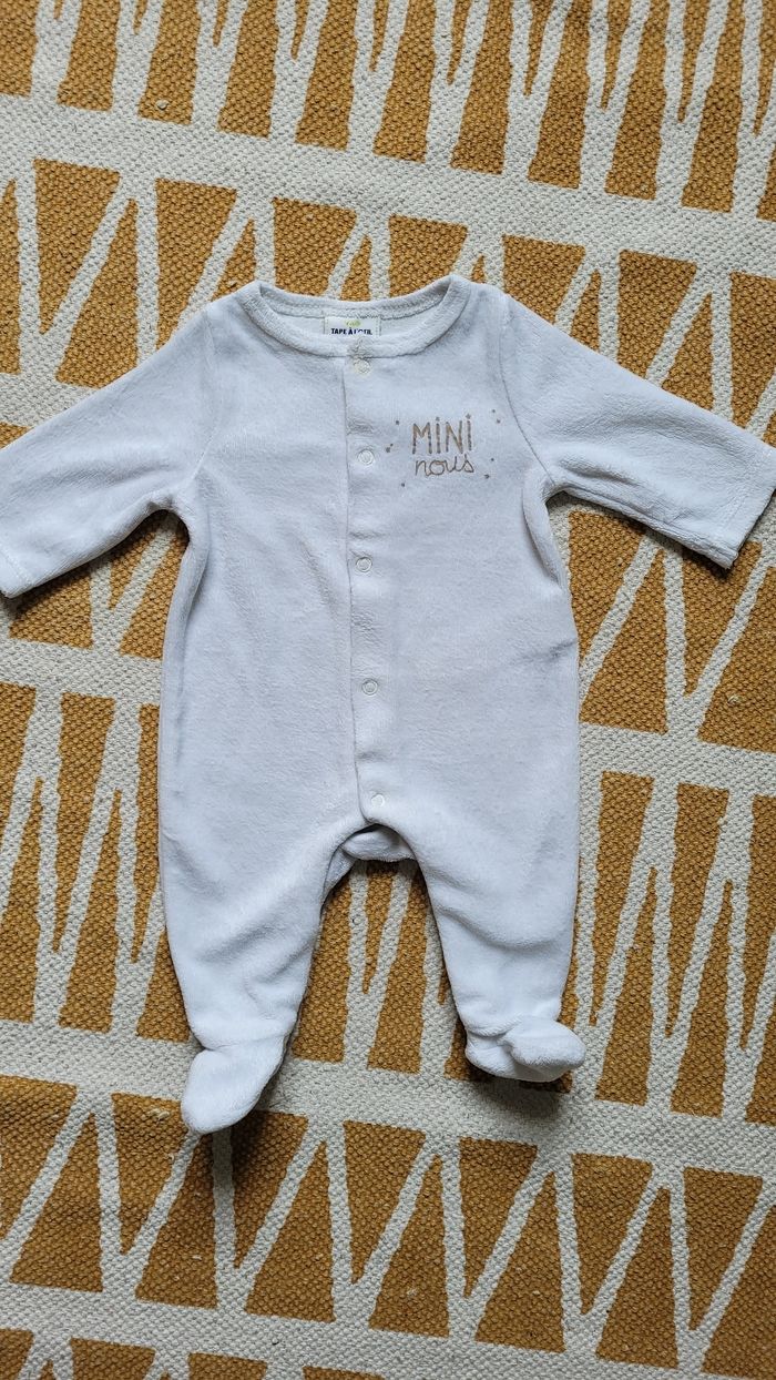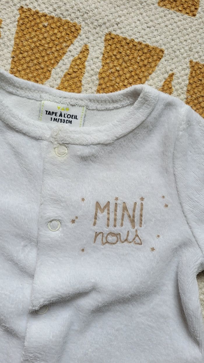 Pyjama blanc 1mois tape à l'œil ouverture sur le devant, "mini nous" mixte. 1ère pression un peu jauni.
