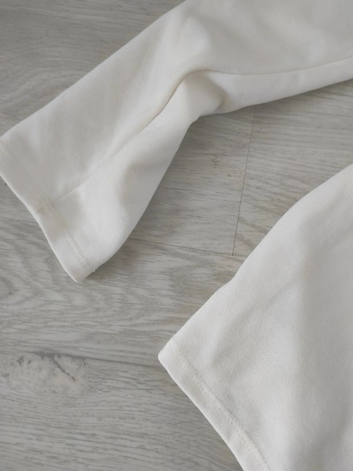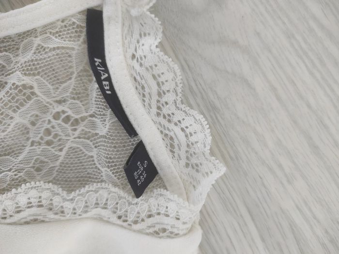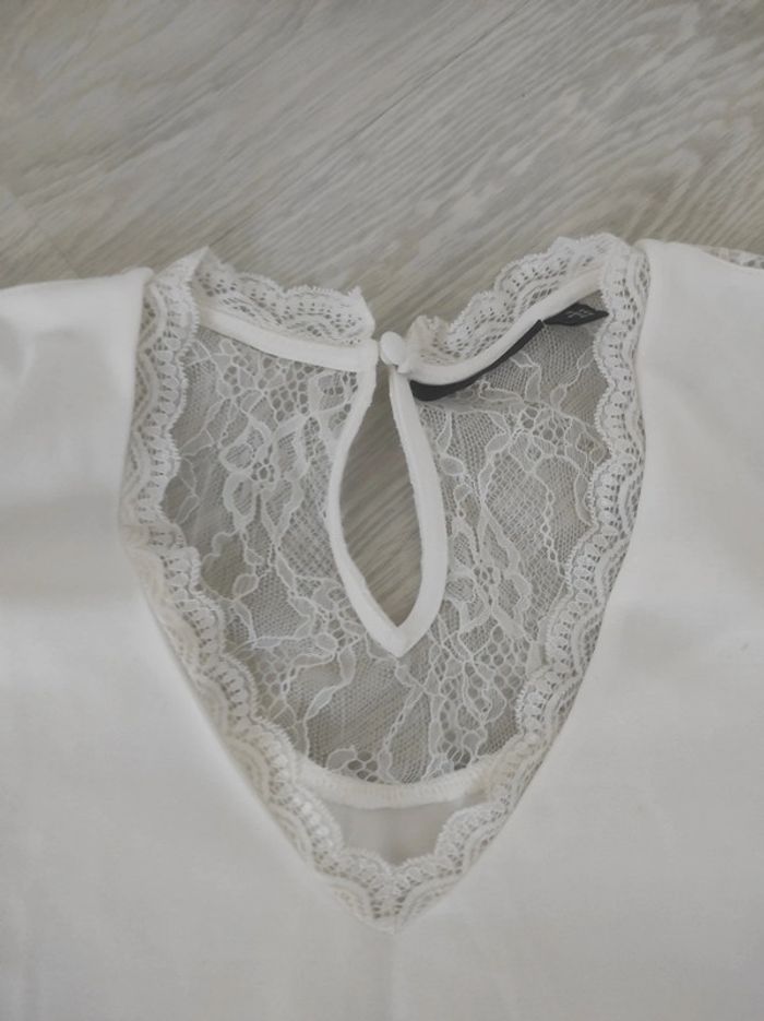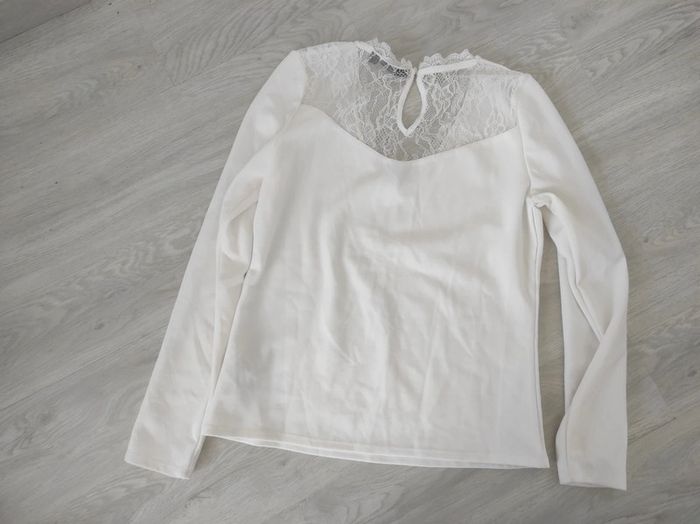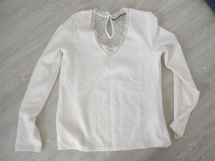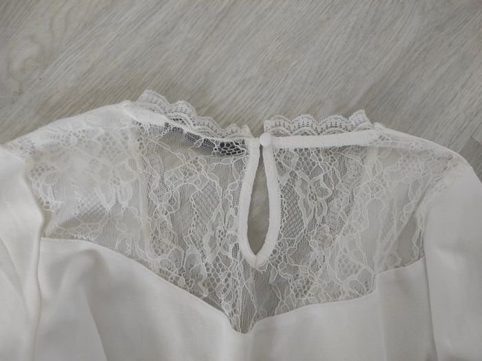 Top blanc matière un peu "épaisse". Empiècement dentelle. Col V et fermeture goutte d'eau au dos avec bouton. Manches longues. Aussi joli habillé qu'à porter au quotidien. #canelle0femme36 #canelle0femme
