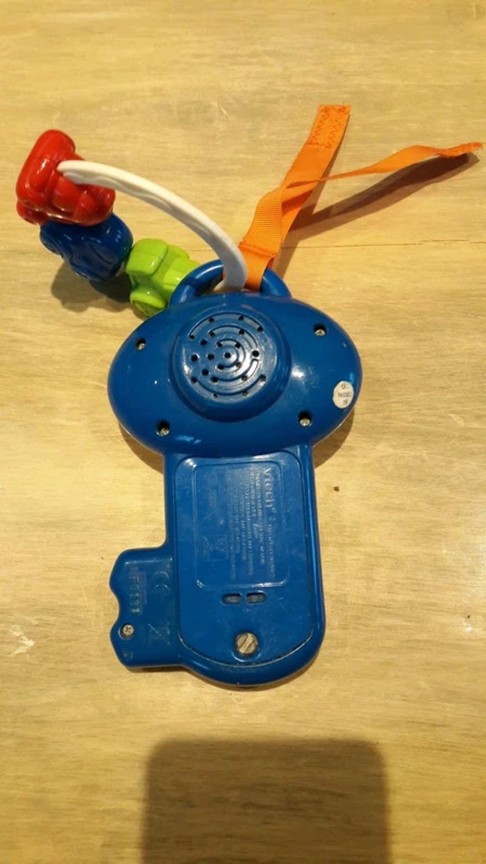 VTECH Clé magique Descriptif produit : Un hochet en forme de clé, parlant, musical et lumineux. S’accroche partout grâce à son attache en tissu. 3 boutons véhicules pour découvrir des mélodies et le nom des objets représentés. Un bouton lumineux et un globe avec une image animée à l’intérieur. Un anneau avec 3 véhicules à manipuler. 5 mélodies Image un peu effacée sur le bouton vert. Bon état