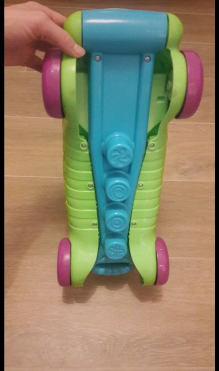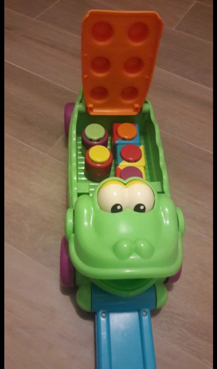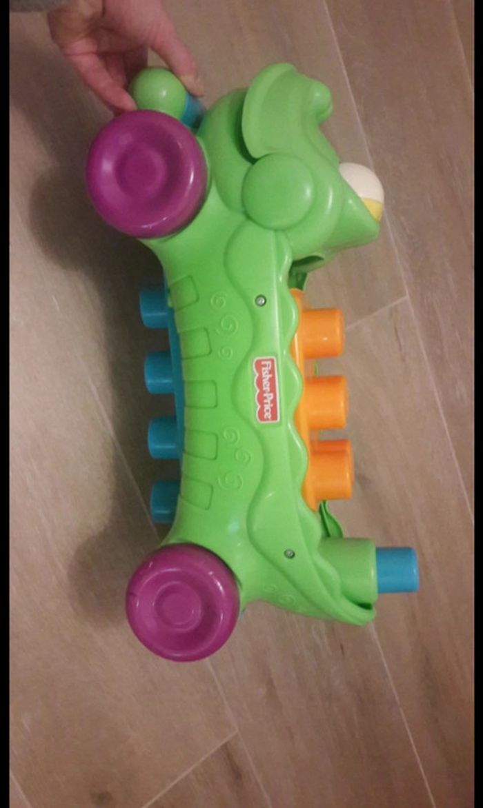 Fisher Price - Croco Blocks rigolo musical Crocodile musical à tirer Avec ces cubes à transporter / empiler Le crocodile adore les manger ! Dimension : 45 x 20 cm Traces d'usure sur les roues, cependant le jouet est en excellent état. Fonctionne avec 3 piles (Non fournie) et 2 niveaux sonores