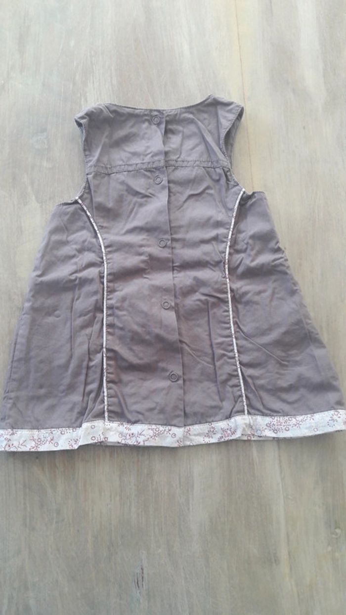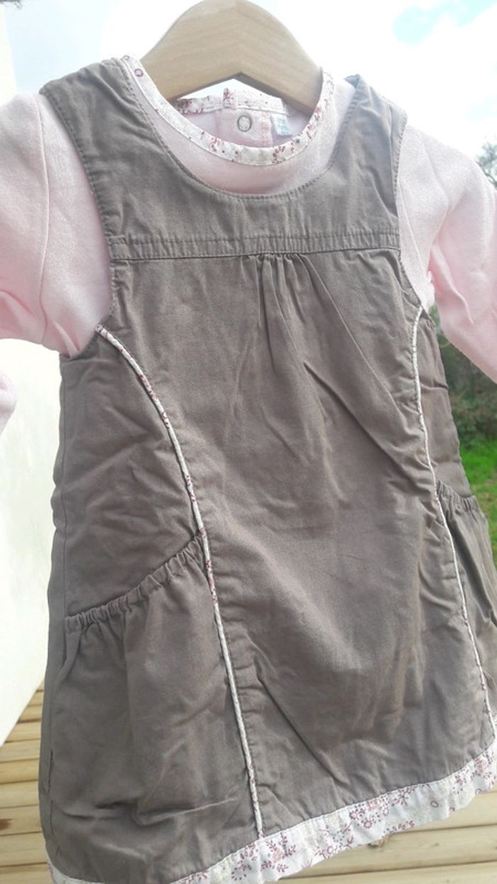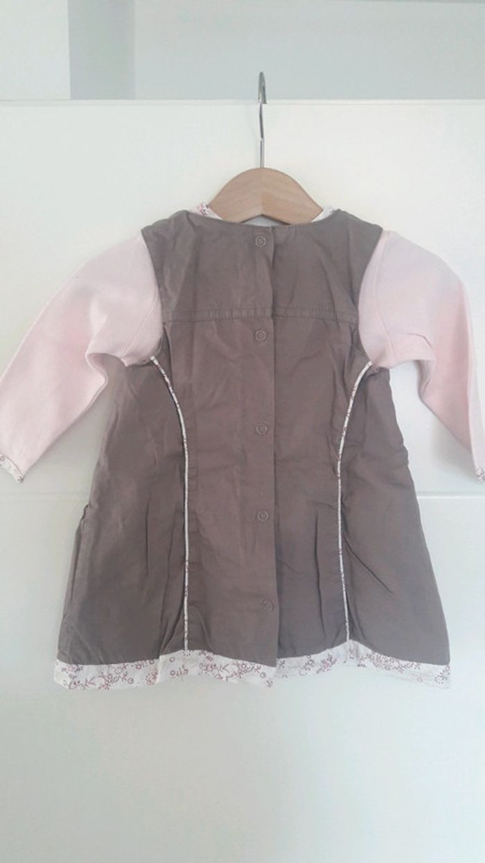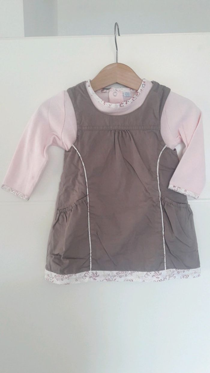 Ensemble robe et tee shirt Ouverture par boutons pression La robe est de couleur taupe, le tee shirt rose clair Taille : 6 mois La 3eme photo est prise en extérieur pour un meilleur rendu des couleurs En excellent état, pas de tâche, pas de trou, non décousu