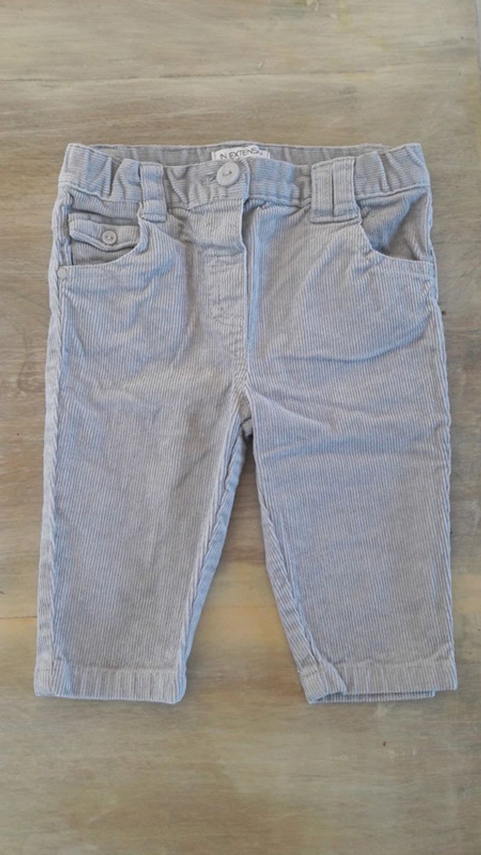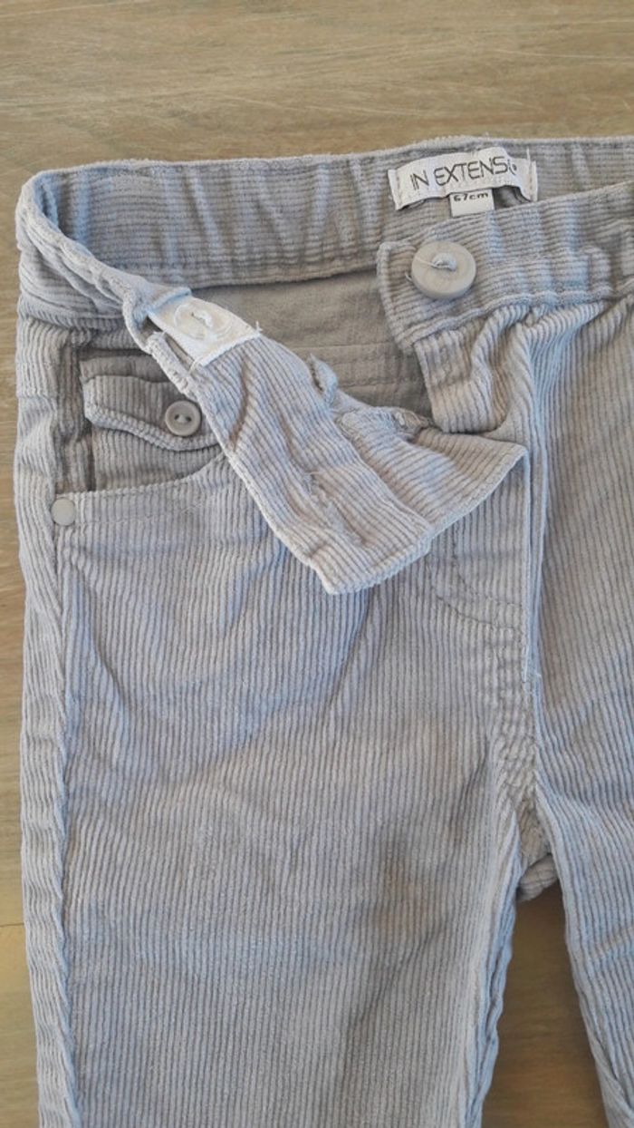 Pantalon en velours côtelé gris Taille : 6 mois / 67 cm Taille réglable par élastique intérieur Longueur totale : 34 cm Longueur entre jambe : 17 cm Largeur taille : 23 cm Neuf, jamais porté