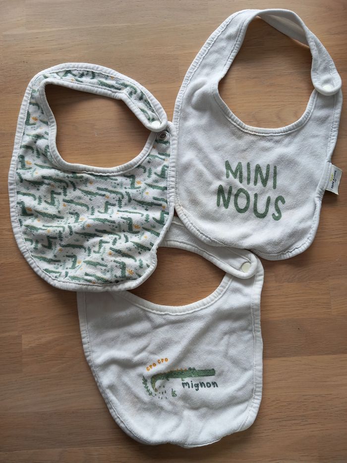 Vends lot de 3 petits bavoirs avec fermeture à pression de marque tape à l'œil dans les tons blanc et vert