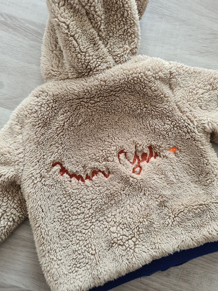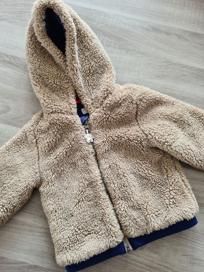 Veste à capuche / manteau beige et bleu à l'intérieur. Assez épaisse à fermeture éclair. "Mini yéti" - 9 mois Mixte