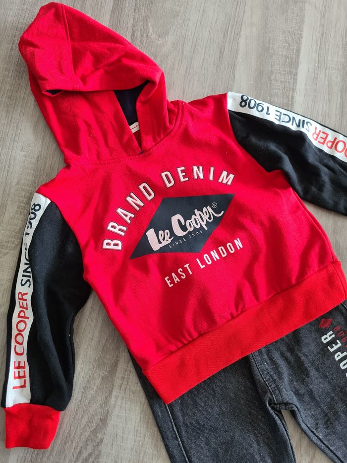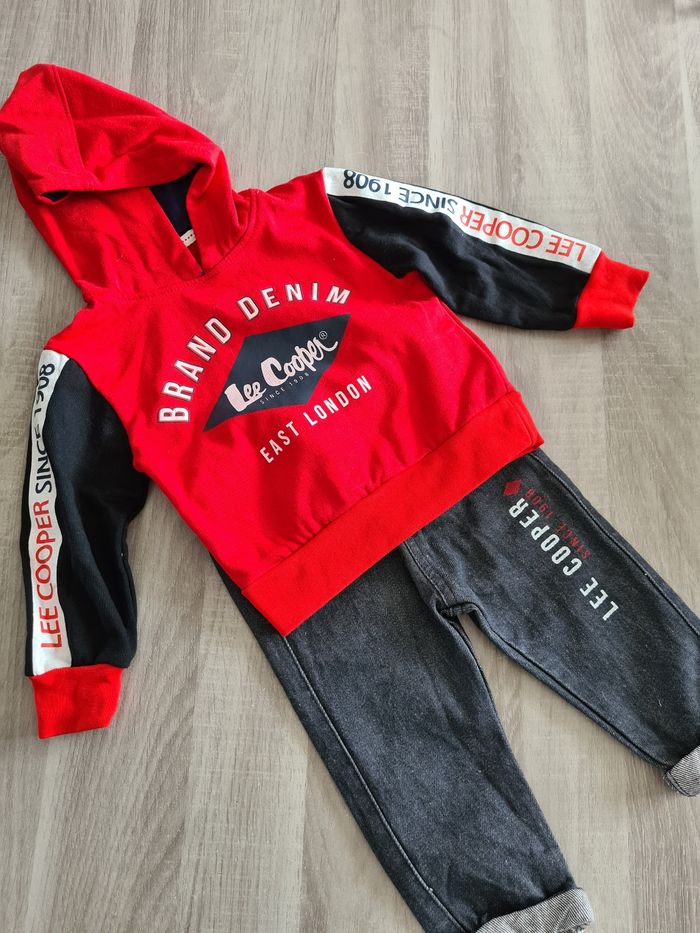 Ensemble sweat à capuche rouge et jean gris Lee Cooper. Taille 9 mois. Jamais porté.