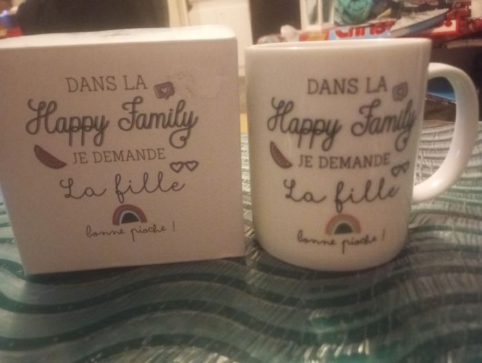 Mug ( dans la famille je demande la fille bonne pioche) dans sa boîte