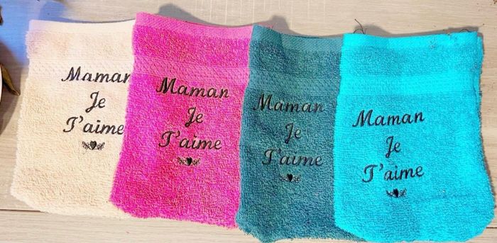 Serviette + gant de toilette 10€ possibilités de rajouter un prénom pour 5€ de plus , une phrase peut être écrite aussi au prix de 10€