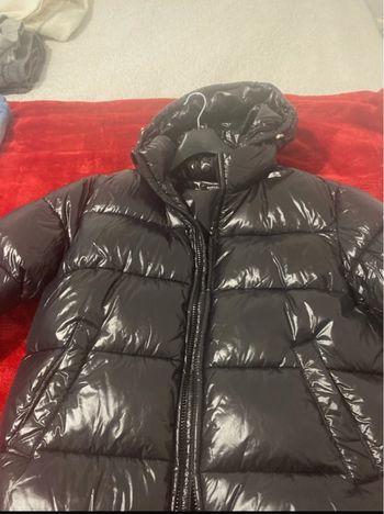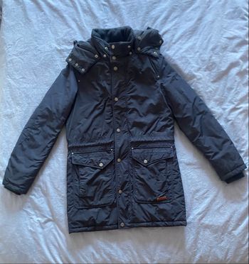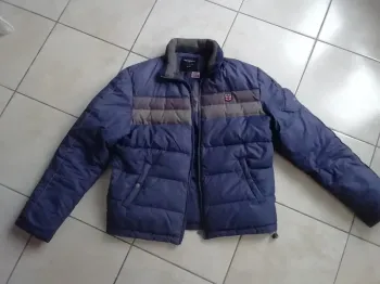 Les photos donnent un blanc jaunâtre c'est à cause du flash, le blouson est bien blanc même s'il aurait besoin d'un nettoyage, taches jaune d'humidité, car il est resté longtemps dans une valise. Il est blanc avec des parties bleu marine et liseré rouge. La capuche au cou et à la tête et les poignets sont réglables. Il manque le lacet en bas pour serrer. Il s'enfile par le cou car c'est une fermeture qui se termine à mi-chemin (voir photos.). Il a 2 poches côtés, 1 sur la poitrine et 1 autre à l'intérieur. C'est un blouson que mon fils portait souvent adolescent. Il est encore en bon état.