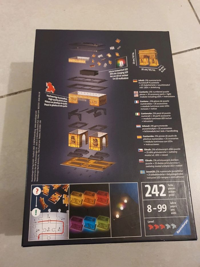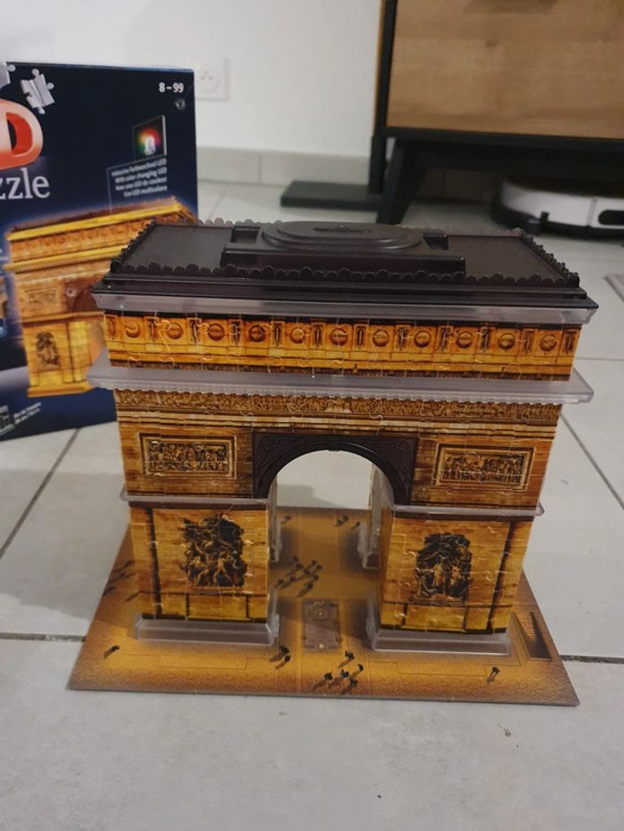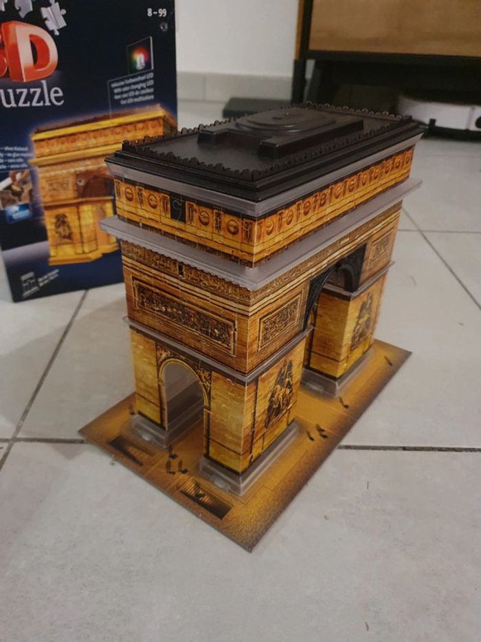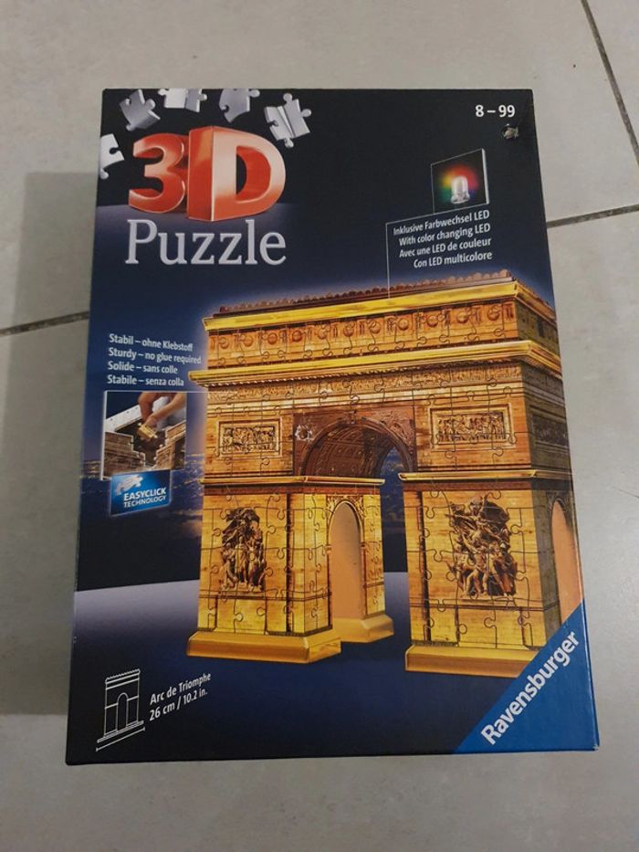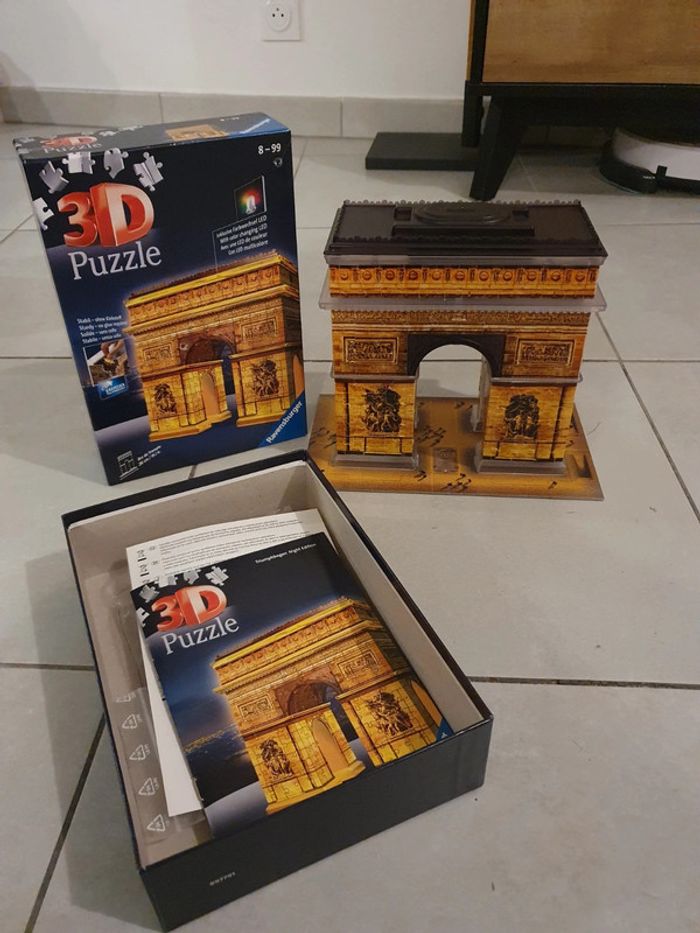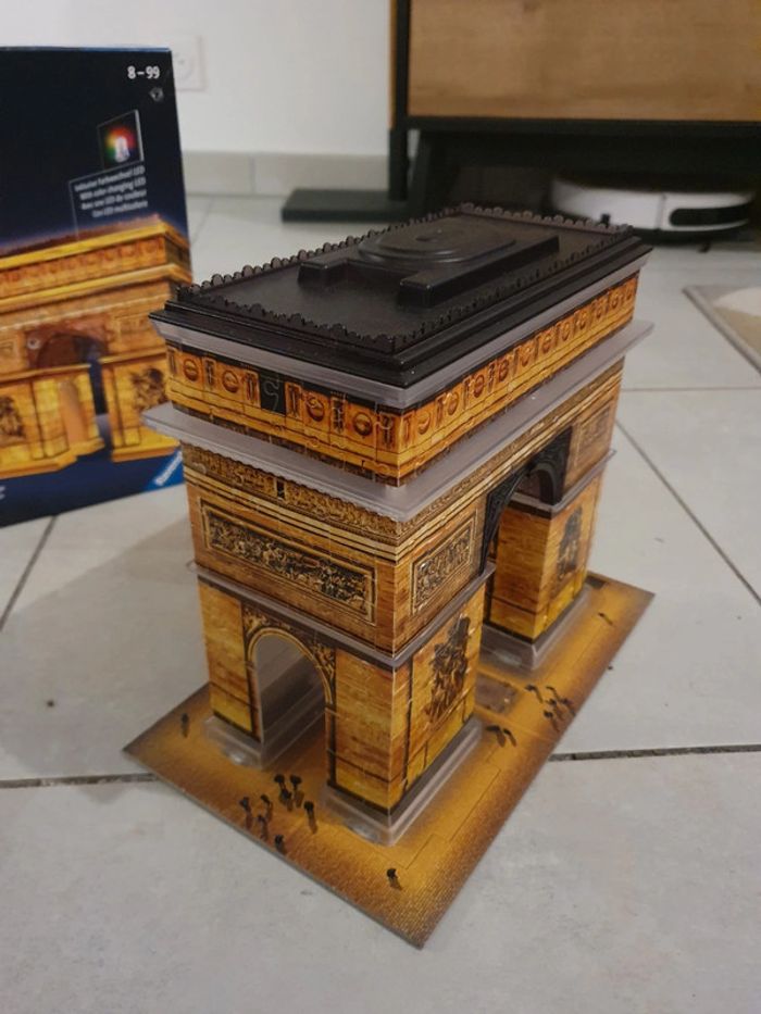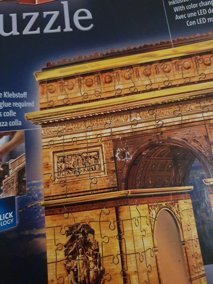 Puzzle 3D, Arc de Triomphe avec LED de couleur. Acheté 33€ chez Cultura. En très bon état et complet évidemment ! Seul la boîte présente des traces enfoncées (voir photo). Je peux l'envoyer totalement démonté ou le démonter seulement en partie (juste pour qu'il rentre dans la boîte). #puzzle #puzzle3d #Paris #arcdetriomphe #ravensburger #ravensburgerpuzzle