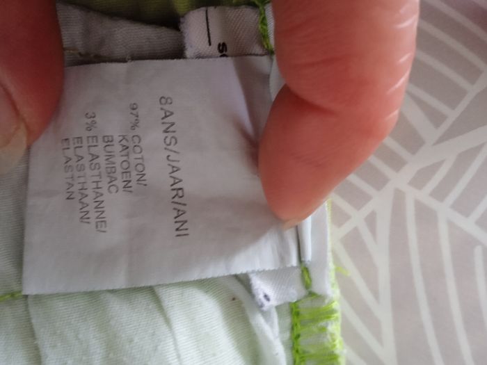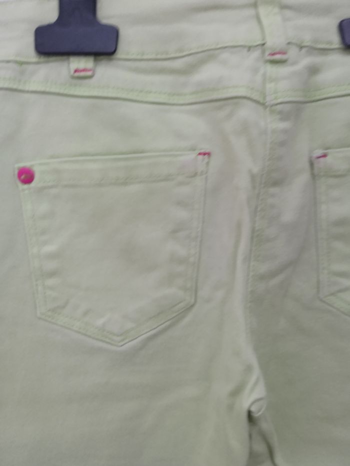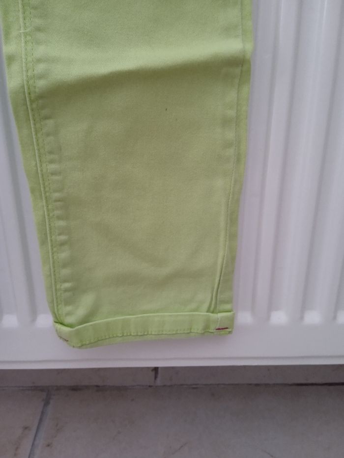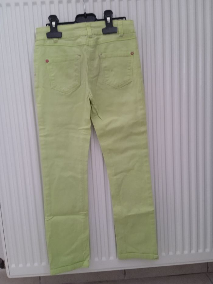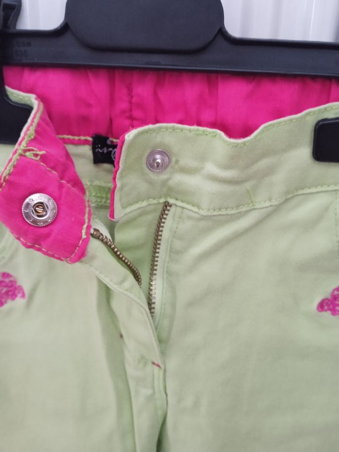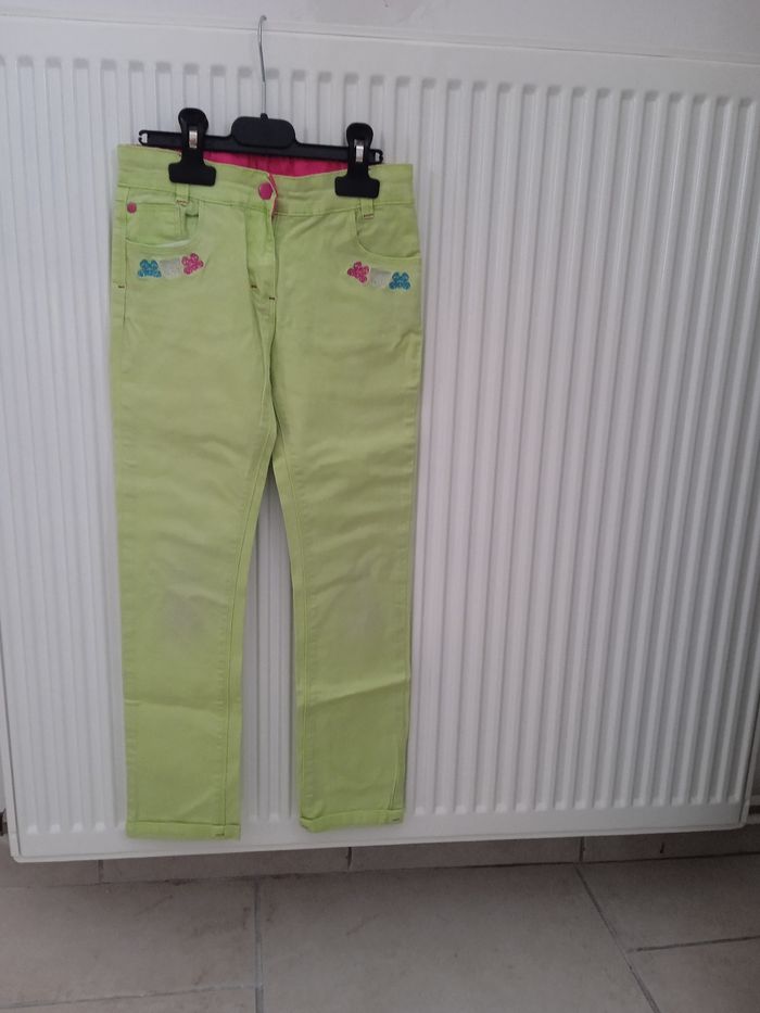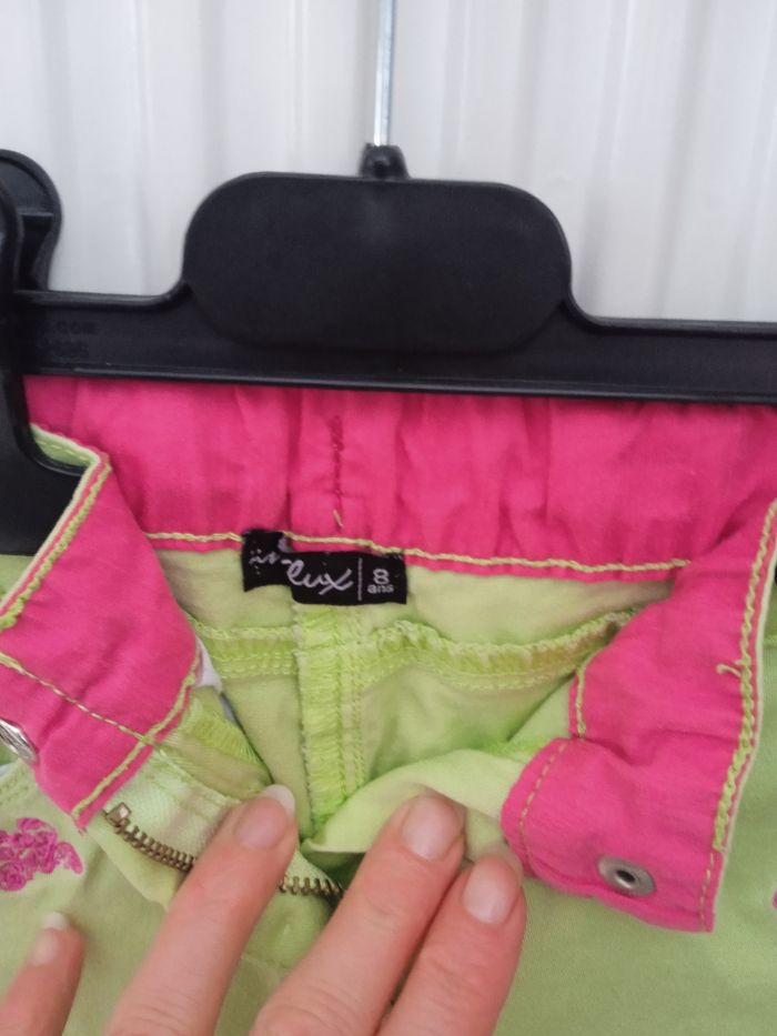 Pantalon de couleur vert anis. Marque influx, taille 8 ans. Comprenant deux poches devant de poche arrière et passant pour ceinture. Motif trois petits papillons au niveau des poches de devant. Ouverture pression et fermeture éclair élastique ajustable à la taille. Légère petite décoloration au niveau des genoux voir photos. Marque influx #fille8ansnade3033