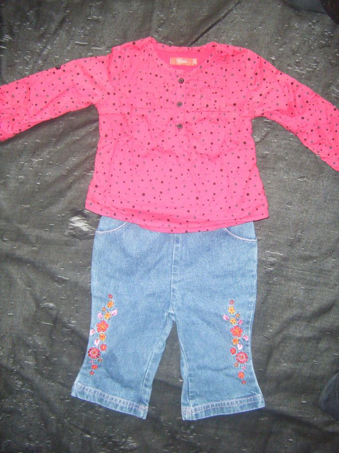 Ensemble 6 mois composé d'une tunique rose fuchsia TISSAIA + jean brodé TOP COQUINE, taille élastiquée, poches et derrière