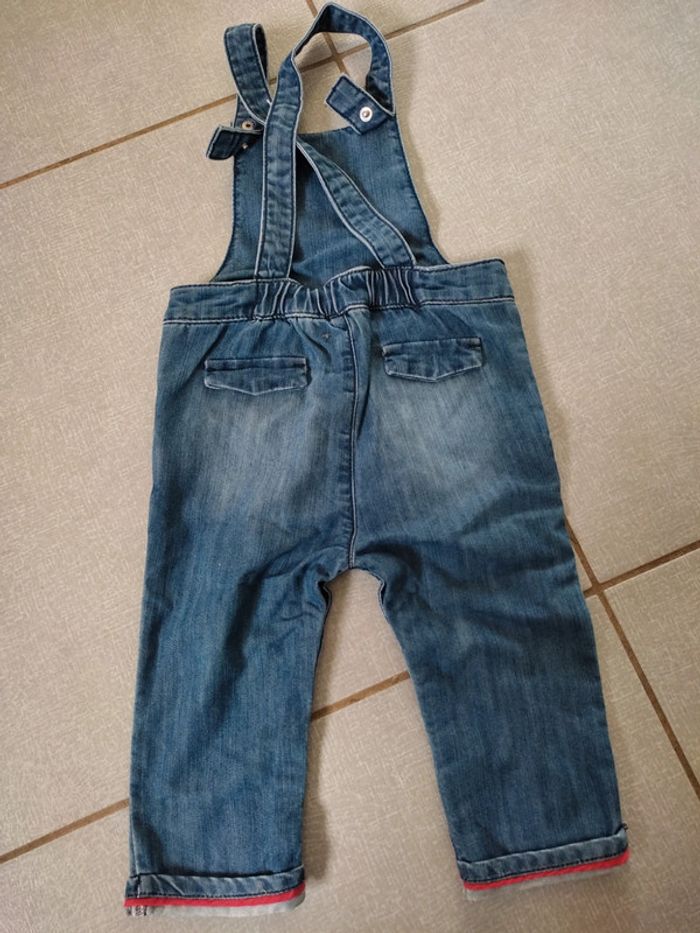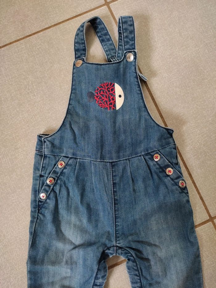 Salopette Jean denim light stone used Bretelles croisées ajustables, entrejambe à pressions, dos élastiqué. Poches et boutons décoratifs Motif poisson Taille 18 mois (80 cm) Foyer non fumeur