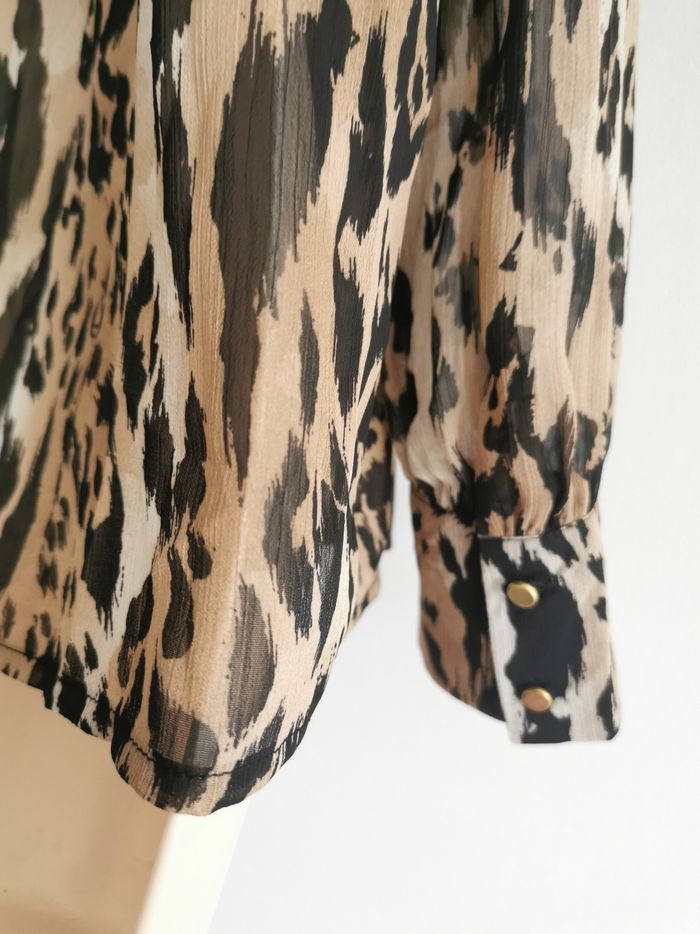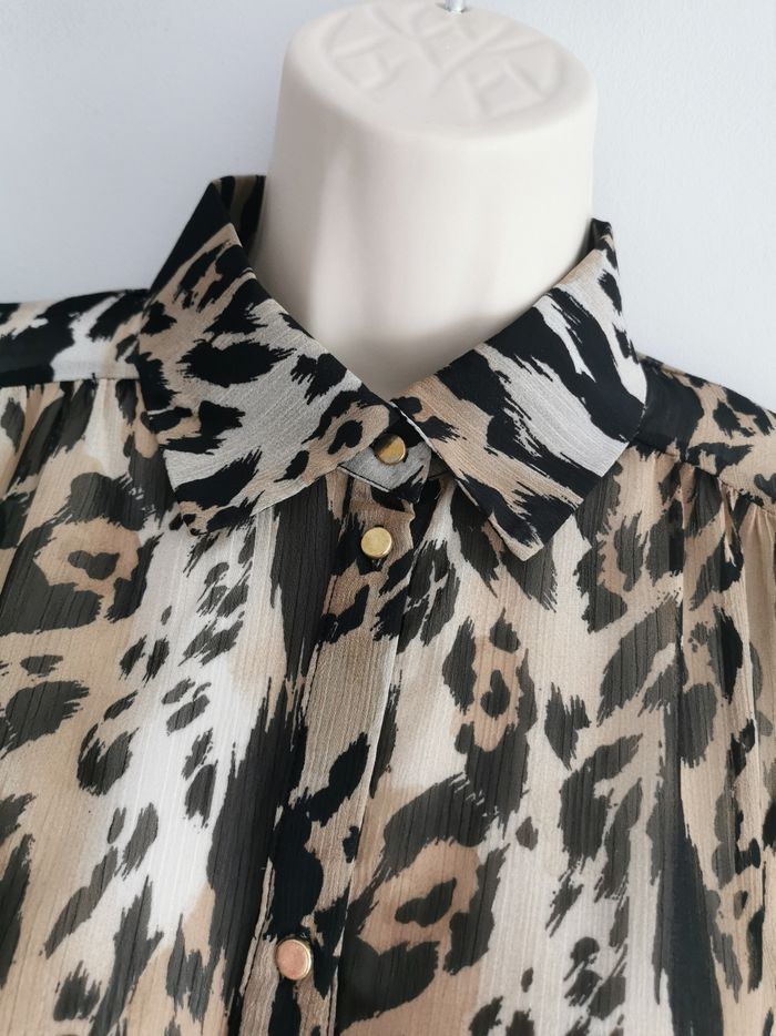 🙎‍♀️ ÉTAT DE L'ARTICLE: 10/10 ✅️ Avec étiquette🔖, jamais portée Chemise voile imprimée 👩 Morgan Taille 34 • Matière: 100% polyester • Tissu léger effet voile, semi-transparent • Coupe droite • Col chemise à revers • Manches longues boutonnées 🟡🟡 au poignet • Fermeture par boutons 🟡🟡🟡 à l'avant • Imprimé animal 🐆 • 📏 Mesure épaules: 32 cm • 📏 Mesure sous aisselles: 50 cm • 📏 Longueur: 60 cm 💰Prix boutique: 55€ Parfait état👌, avec étiquette🏷️, jamais portée 🔵🔵
