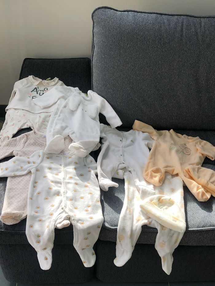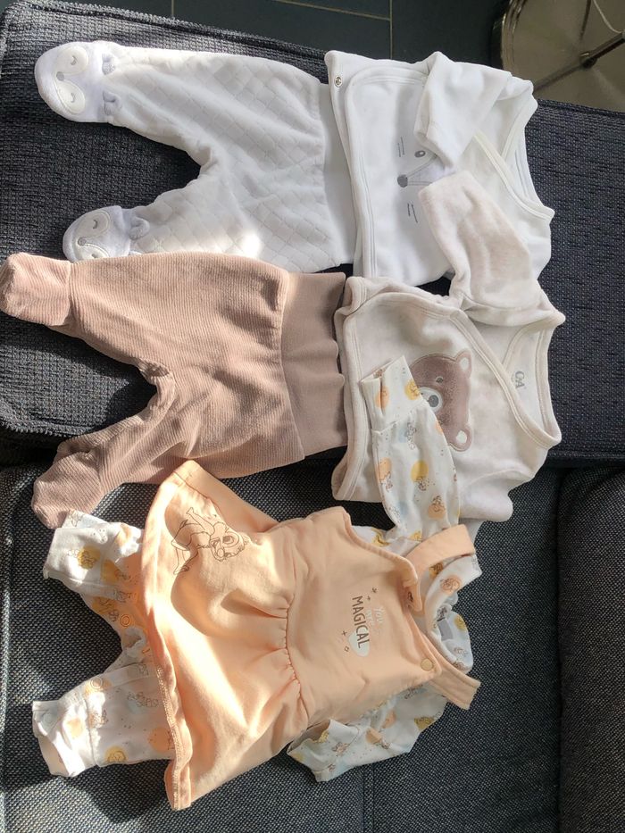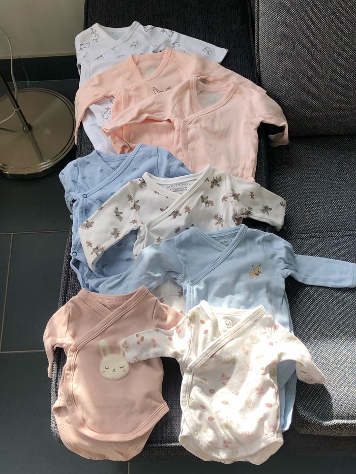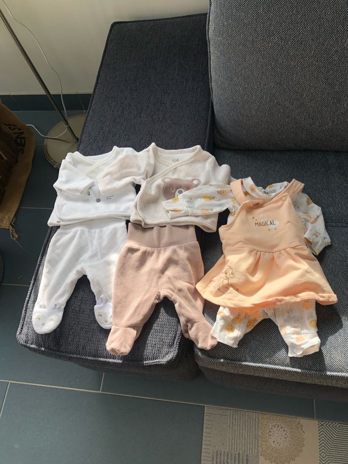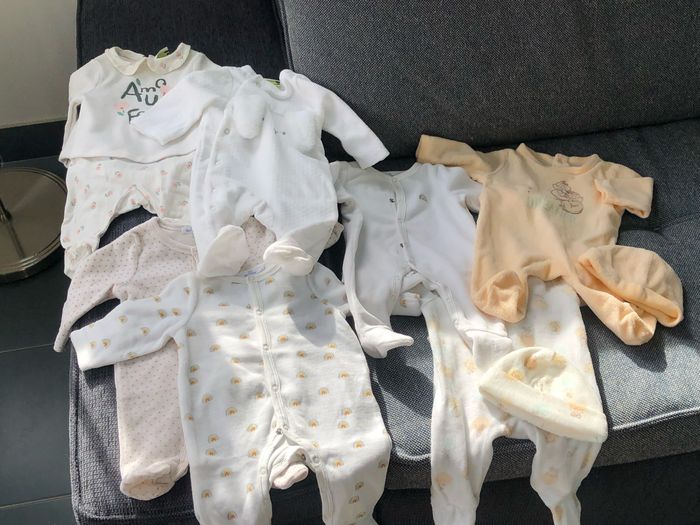 Lot naissance / 1 mois, idéal pour le départ à la maternité. J’ai eu assez de tous ces vêtements pour les premières semaines de ma poupette. 8 grenouillères, 1 robe, 2 ensembles pantalon-haut en velours, 8 bodies, 2 bonnets, 6 paires de chaussettes. Soit 26 articles. Le tout en très bon état, lavé et repassé. Bout’chou (Monoprix), Tape à l’oeil, Dysney Baby, C&A, tex