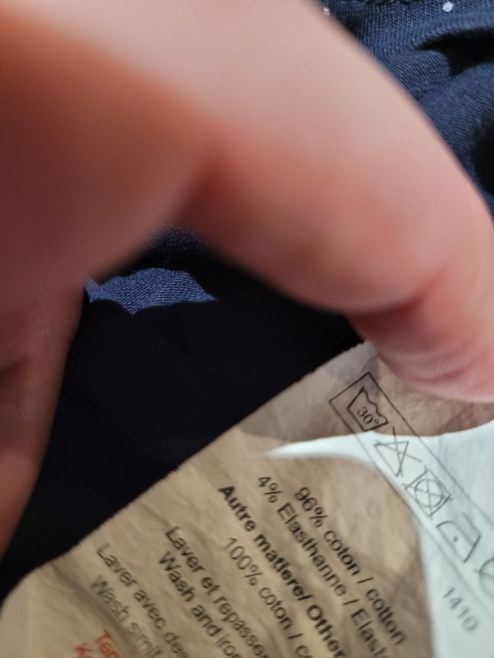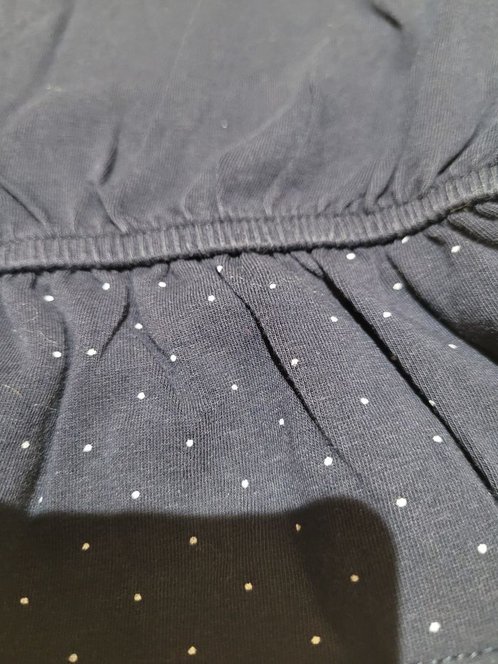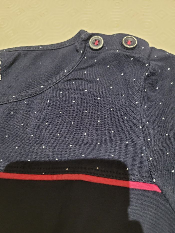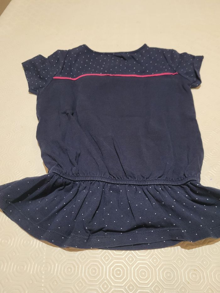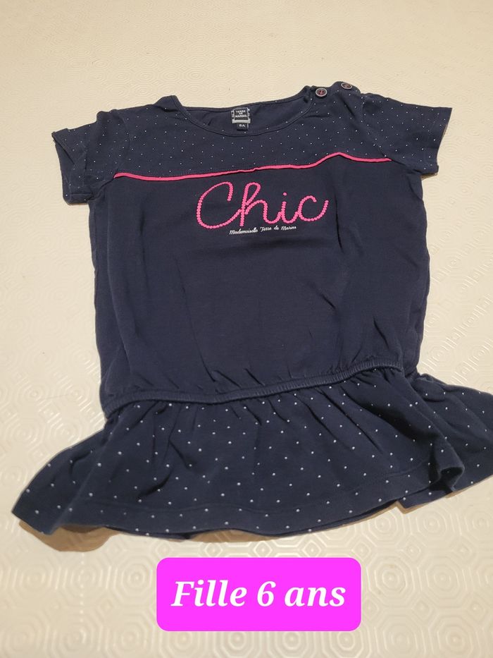 T-shirt/tunique manches courtes. Bleu à points blancs. Écriture et broderie rose. Reserré à la taille. Deux boutons sur l'épaule. Marque : Terre de marins Taille : 6 ans
