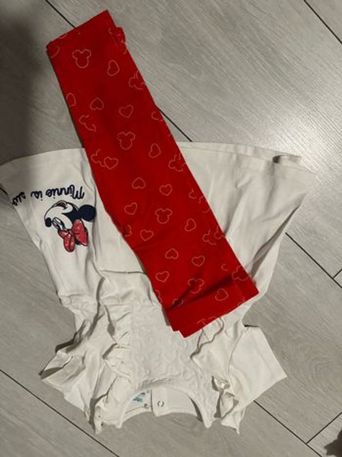 Ensemble Minnie haut blanc manche court et Leeging rouge avec dessin de tête de Minnie et cœur