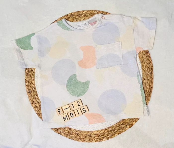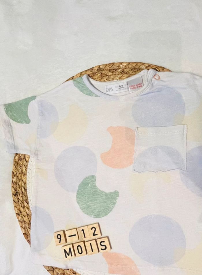 🍁 En très bon état, porté mais pas de défaut🍁 T-shirt à manches courtes blanc cassé à motifs pastels, 1 pression à l’encolure, 💯 coton 🧷 Taille indiquée 6-9 mois (74cm)mais taille grand, correspond plutôt à un 9-12 mois Lavé et repassé avant envoi, maison non-fumeur