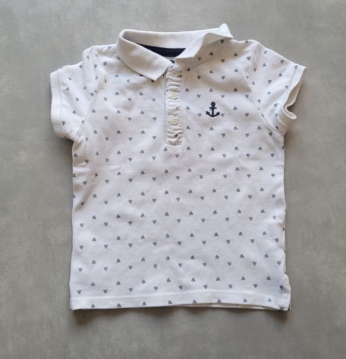 Polo manches courtes, dans les tons blancs avec petit motif teiangle et ancre cote coeur, de la marque Kiabi, taille 18 mois (77-82 cm), en très bon état. Article lavé pour la vente.