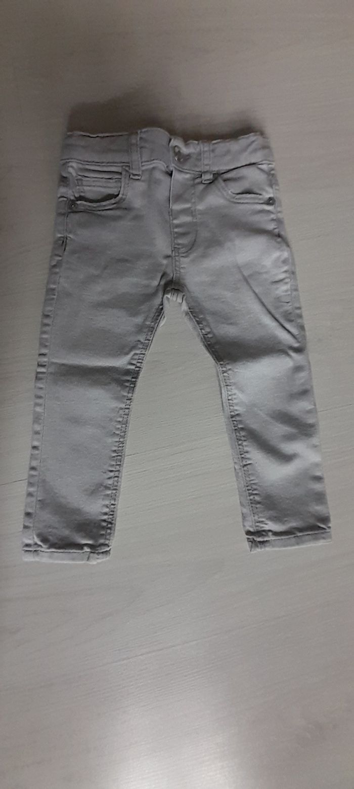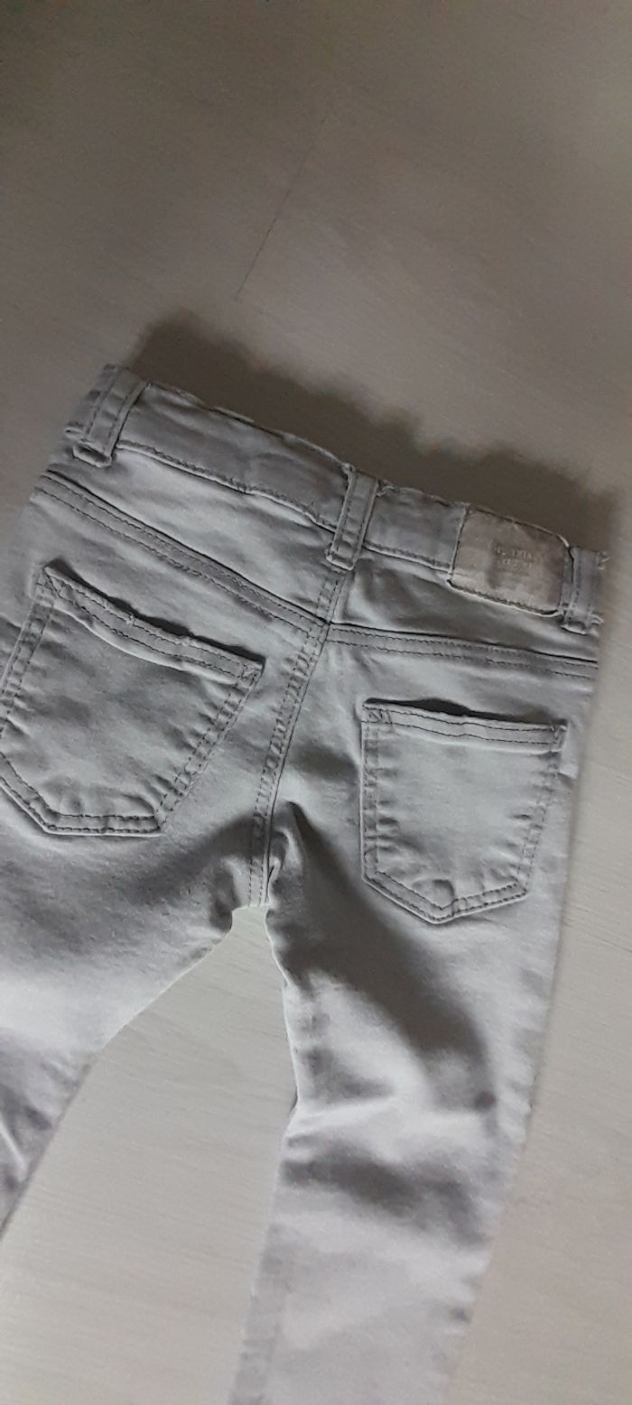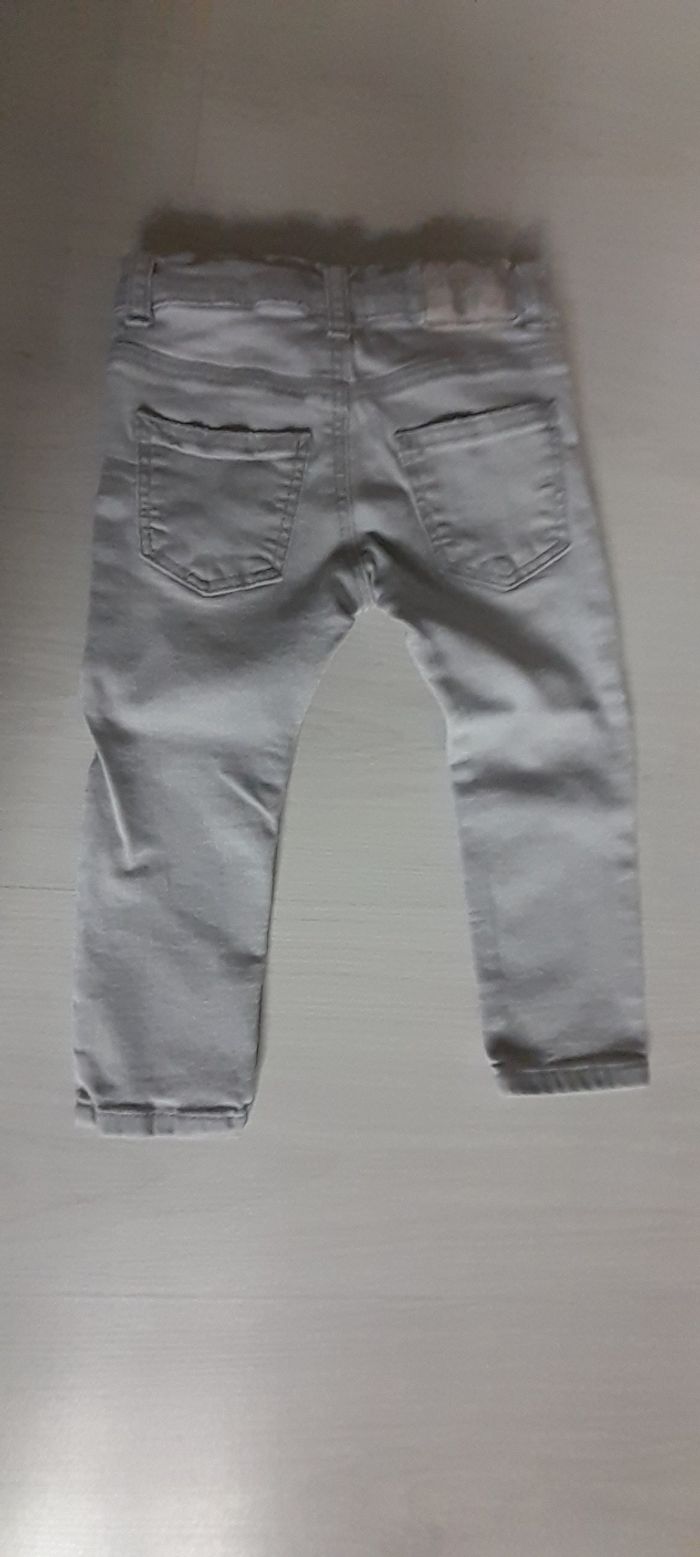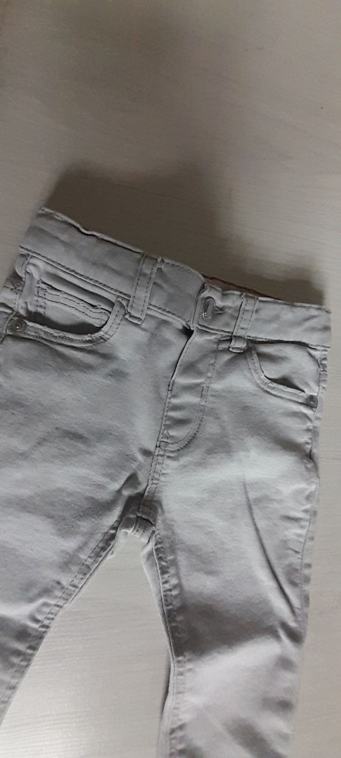 Jeans T 12/18 mois Marque ZARA Couleur gris clair 3 poches devant 2 poches arrière Attache bouton et taille élastique avec possibilité de resserrage 65% coton/ 21% Polyester/ 11 % viscose et 3 % Elasthane Neuf jamais porté